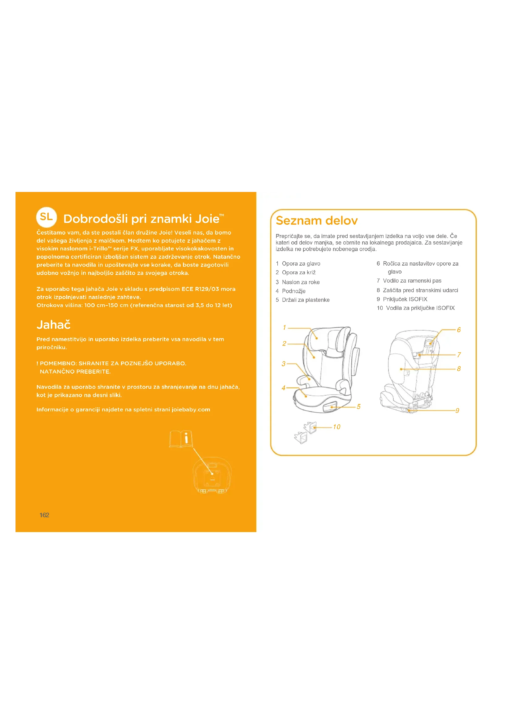 Čestitamo vam, da ste postali član družine Joie! Veseli nas, da bomo del vašega življenja z malčkom. Medtem ko potujete z jahačem z visokim naslonom i-Trillo™ serije FX, uporabljate visokokakovosten in popolnoma certificiran izboljšan sistem za zadrževanje otrok. Natančno preberite ta navodila in upoštevajte vse korake, da boste zagotovili udobno vožnjo in najboljšo zaščito za svojega otroka.Za uporabo tega jahača Joie v skladu s predpisom ECE R129/03 mora otrok izpolnjevati naslednje zahteve.Otrokova višina: 100cm–150cm (referenčna starost od 3,5 do 12 let) Jahač Pred namestitvijo in uporabo izdelka preberite vsa navodila v tem priročniku.! POMEMBNO: SHRANITE ZA POZNEJŠO UPORABO. NATANČNO PREBERITE.Navodila za uporabo shranite v prostoru za shranjevanje na dnu jahača, kot je prikazano na desni sliki.Informacije o garanciji najdete na spletni strani joiebaby.com