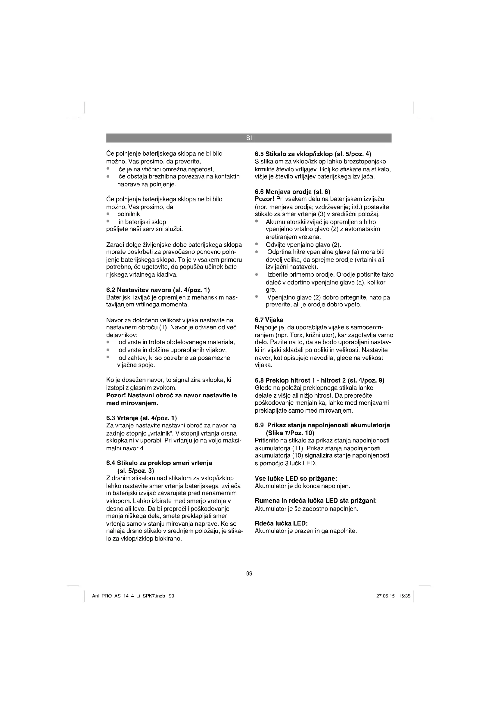Nevarnost! - Da bi zmanjšali tveganje poškodb, preberite navodila za uporabo! Pozor! Uporabljajte zaščito za ušesa. Učinkovanje hrupa lahko povzroči izgubo sluha. Pozor! Uporabljajte zaščitna očala. Med delom nastajajoče iskre ali iz naprave izletajoči delčki, ostružki in prah lahko povzročijo izgubo vida. Pozor! Uporabljajte protiprašno zaščitno masko. Pri obdelavi lesa in drugih materialov lahko pride do nastajanja zdravju škodljivega prahu. Materiala, ki vsebuje azbest, ne smete obdelovati! Da preprečite poškodovanje menjalnika, lahko med menjavami preklapljate samo med miro- vanjem. Anl_PRO_AS_14_4_Li_SPK7.indb 96Anl_PRO_AS_14_4_Li_SPK7.indb 96 27.05.15 15:3527.05.15 15:35SI