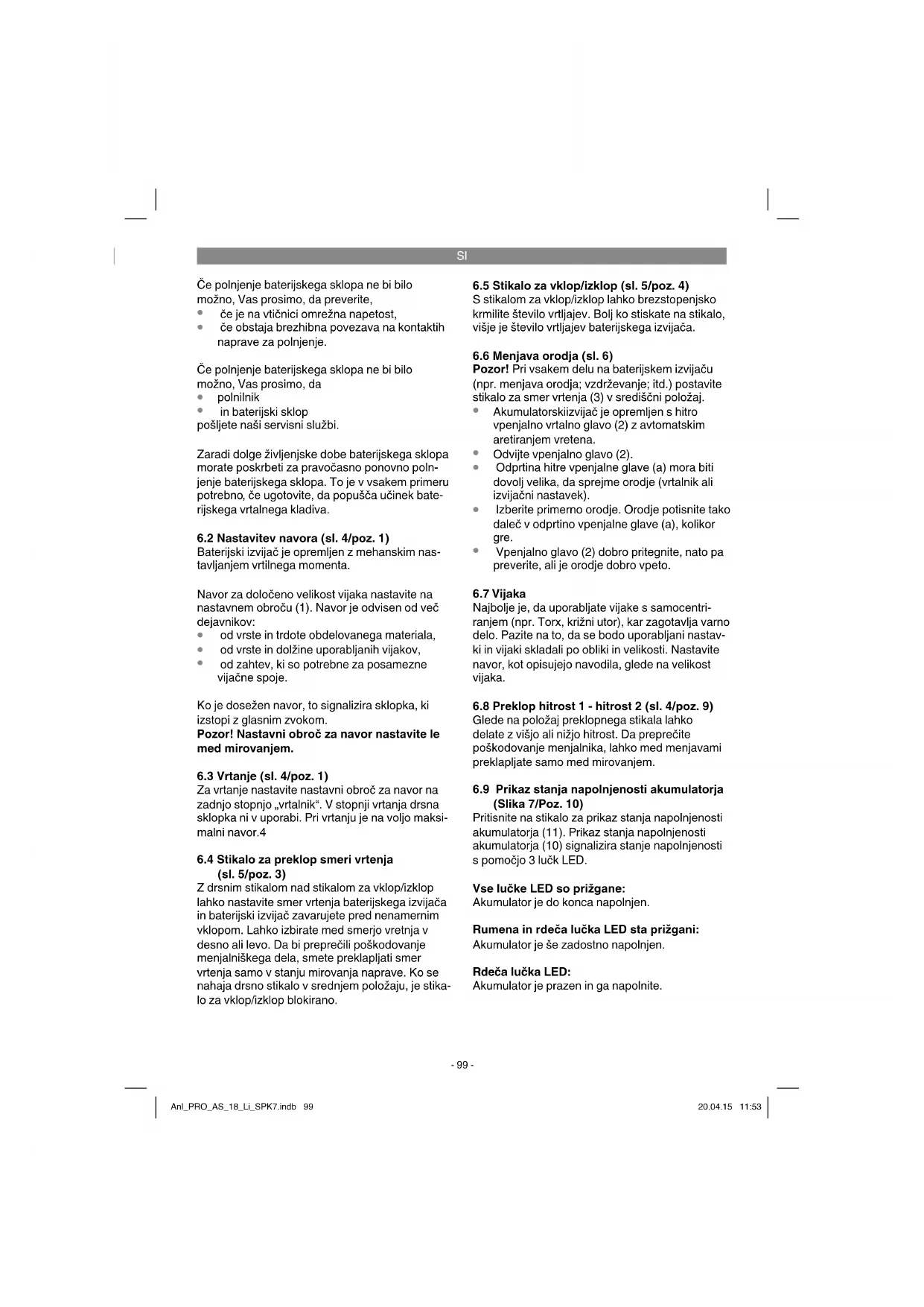 Nevarnost! - Da bi zmanjšali tveganje poškodb, preberite navodila za uporabo! Pozor! Uporabljajte zaščito za ušesa. Učinkovanje hrupa lahko povzroči izgubo sluha. Pozor! Uporabljajte zaščitna očala. Med delom nastajajoče iskre ali iz naprave izletajoči delčki, ostružki in prah lahko povzročijo izgubo vida. Pozor! Uporabljajte protiprašno zaščitno masko. Pri obdelavi lesa in drugih materialov lahko pride do nastajanja zdravju škodljivega prahu. Materiala, ki vsebuje azbest, ne smete obdelovati! Da preprečite poškodovanje menjalnika, lahko med menjavami preklapljate samo med miro- vanjem. Anl_PRO_AS_18_Li_SPK7.indb 96Anl_PRO_AS_18_Li_SPK7.indb 96 20.04.15 11:5320.04.15 11:53SI