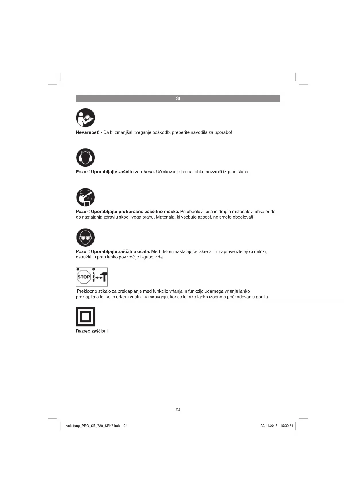 Nevarnost! - Da bi zmanjšali tveganje poškodb, preberite navodila za uporabo! Pozor! Uporabljajte zaščito za ušesa. Učinkovanje hrupa lahko povzroči izgubo sluha. Pozor! Uporabljajte zaščitna očala. Med delom nastajajoče iskre ali iz naprave izletajoči delčki, ostružki in prah lahko povzročijo izgubo vida. Pozor! Uporabljajte protiprašno zaščitno masko. Pri obdelavi lesa in drugih materialov lahko pride do nastajanja zdravju škodljivega prahu. Materiala, ki vsebuje azbest, ne smete obdelovati! Preklopno stikalo za preklaplanje med funkcijo vrtanja in funkcijo udarnega vrtanja lahko preklapljate le, ko je udarni vrtalnik v mirovanju, ker se le tako lahko izognete poškodovanju gonila Razred zaščite II Anleitung_PRO_SB_720_SPK7.indb 94Anleitung_PRO_SB_720_SPK7.indb 94 02.11.2016 15:02:5102.11.2016 15:02:51SI