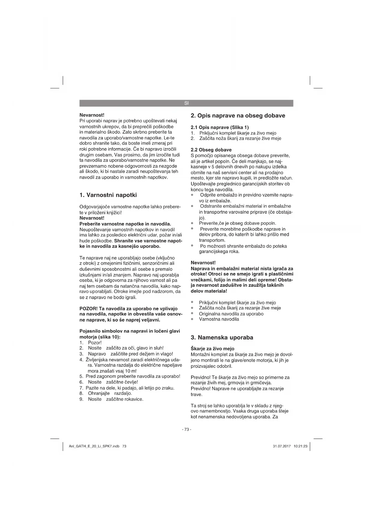 Škarje za živo mejo Montažni komplet za škarje za živo mejo je dovol- jeno montirati le na glave/enote motorja, ki jih je proizvajalec odobril. Previdno! Te škarje za živo mejo so primerne za rezanje živih mej, grmovja in grmičevja. Previdno! Naprave ne uporabljajte za rezanje trave. Ta stroj se lahko uporablja le v skladu z njeg- ovo namembnostjo. Vsaka druga uporaba šteje kot nenamenska nedovoljena uporaba. Za Anl_GATH_E_20_Li_SPK7.indb 73Anl_GATH_E_20_Li_SPK7.indb 73 31.07.2017 10:21:2331.07.2017 10:21:23SI