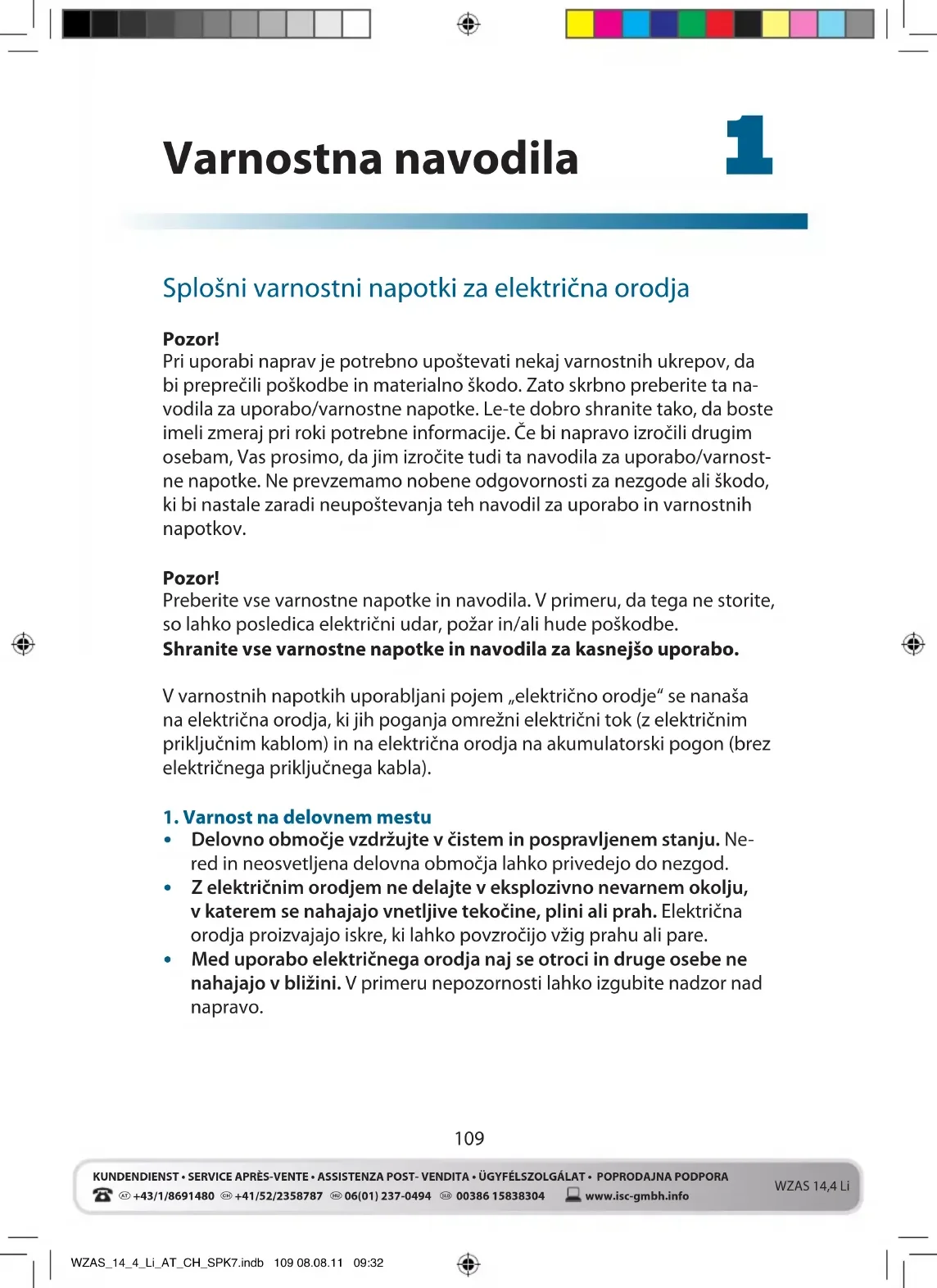 +43/1/8691480 +41/52/2358787 06(01) 237-0494 00386 15838304KUNDENDIENST • SERVICE APRÈS-VENTE • ASSISTENZA POST- VENDITA • ÜGYFÉLSZOLGÁLAT • POPRODAJNA PODPORAwww.isc-gmbh.infoWZAS 14,4 Li Splošni varnostni napotki za električna orodja Pozor! Pri uporabi naprav je potrebno upoštevati nekaj varnostnih ukrepov, da bi preprečili poškodbe in materialno škodo. Zato skrbno preberite ta na- vodila za uporabo/varnostne napotke. Le-te dobro shranite tako, da boste imeli zmeraj pri roki potrebne informacije. Če bi napravo izročili drugim osebam, Vas prosimo, da jim izročite tudi ta navodila za uporabo/varnost- ne napotke. Ne prevzemamo nobene odgovornosti za nezgode ali škodo, ki bi nastale zaradi neupoštevanja teh navodil za uporabo in varnostnih napotkov. Pozor! Preberite vse varnostne napotke in navodila. V primeru, da tega ne storite, so lahko posledica električni udar, požar in/ali hude poškodbe. Shranite vse varnostne napotke in navodila za kasnejšo uporabo. V varnostnih napotkih uporabljani pojem „električno orodje“ se nanaša na električna orodja, ki jih poganja omrežni električni tok (z električnim priključnim kablom) in na električna orodja na akumulatorski pogon (brez električnega priključnega kabla).