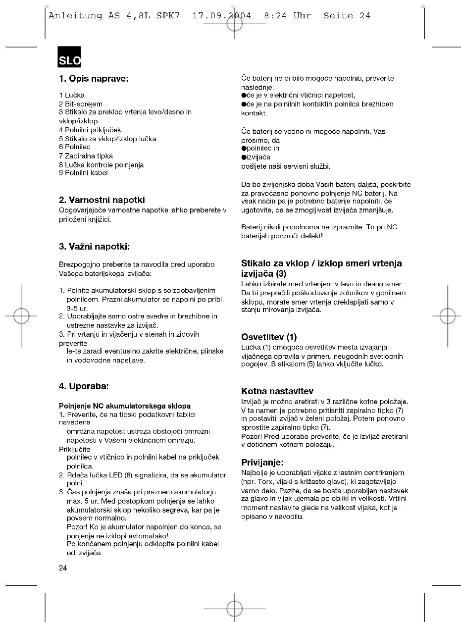 max. 5 ur. Med postopkom polnjenja se lahko akumulatorski sklop nekoliko segreva, kar pa je povsem normalno. Pozor! Ko je akumulator napolnjen do konca, se ponjenje ne izklopi avtomatsko! Po končanem polnjenju odklopite polnilni kabel od izvijača. Če baterij ne bi bilo mogoče napolniti, preverite naslednje: če je v električni vtičnici napetost, če je na polnilnih kontaktih polnilca brezhiben kontakt. Če baterij še vedno ni mogoče napolniti, Vas prosimo, da polnilec in izvijača pošljete naši servisni službi. Da bo življenjska doba Vaših baterij daljša, poskrbite za pravočasno ponovno polnjenje NC baterij. Na vsak način pa je potrebno baterije napolniti, če ugotovite, da se zmogljivost izvijača zmanjšuje. Baterij nikoli popolnoma ne izpraznite. To pri NC baterijah povzroči defekt! Stikalo za vklop / izklop smeri vrtenja izvijača (3) Lahko izbirate med vrtenjem v levo in desno smer. Da bi preprečili poškodovanje zobnikov v gonilnem sklopu, morate smer vrtenja preklapljati samo v stanju mirovanja izvijača. Osvetlitev (1) Lučka (1) omogoča osvetlitev mesta izvajanja vijačnega opravila v primeru neugodnih svetlobnih pogojev. S stikalom (5) lahko vključite lučko. Kotna nastavitev Izvijač je možno aretirati v 3 različne kotne položaje. V ta namen je potrebno pritisniti zapiralno tipko (7) in postaviti izvijač v želeni položaj. Potem ponovno sprostite zapiralno tipko (7). Pozor! Pred uporabo preverite, če je izvijač aretirani v dotičnem kotnem položaju. Privijanje: Najbolje je uporabljati vijake z lastnim centriranjem (npr. Torx, vijaki s križasto glavo), ki zagotavljajo varno delo. Pazite, da se bosta uporabljen nastavek za glavo in vijak ujemala po obliki in velikosti. Vrtilni moment nastavite glede na velikost vijaka, kot je opisano v navodilu.