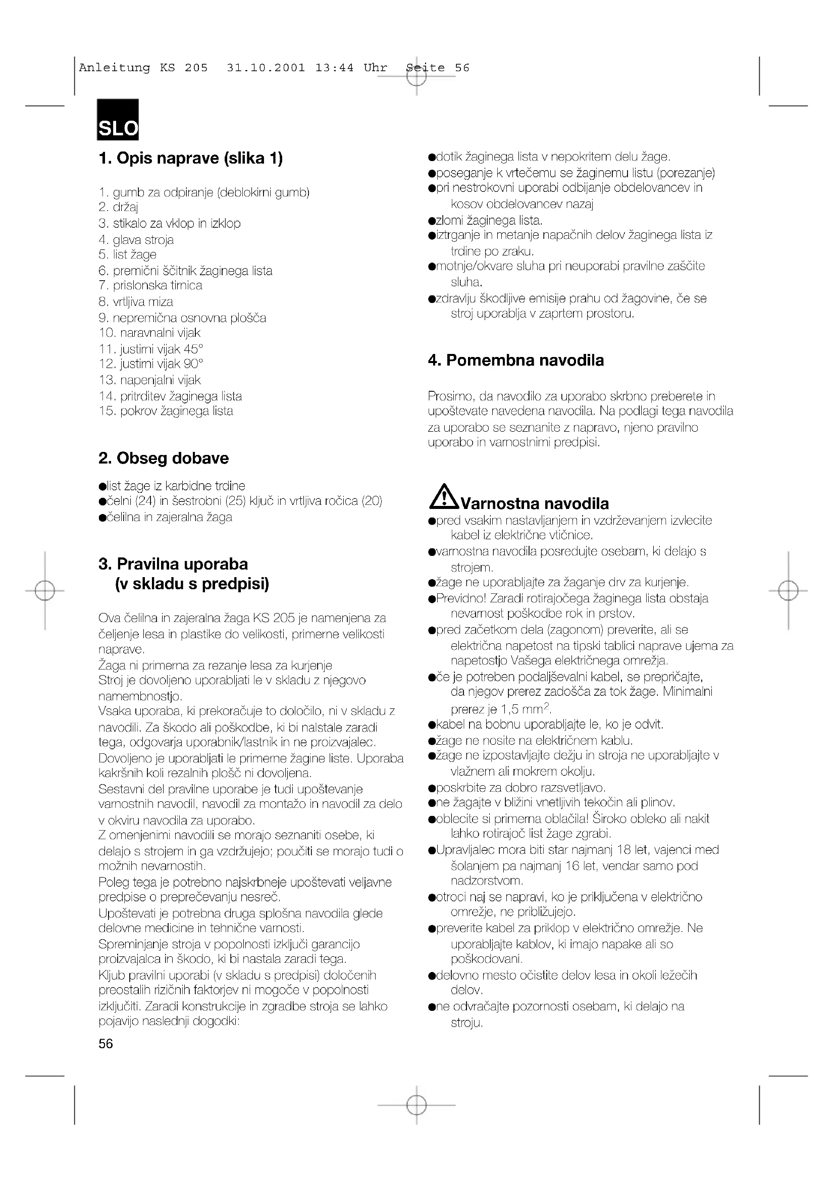 kabel na bobnu uporabljajte le, ko je odvit. žage ne nosite na električnem kablu. žage ne izpostavljajte dežju in stroja ne uporabljajte v vlažnem ali mokrem okolju. poskrbite za dobro razsvetljavo. ne žagajte v bližini vnetljivih tekočin ali plinov. oblecite si primerna oblačila! Široko obleko ali nakit lahko rotirajoč list žage zgrabi. Upravljalec mora biti star najmanj 18 let, vajenci med šolanjem pa najmanj 16 let, vendar samo pod nadzorstvom. otroci naj se napravi, ko je priključena v električno omrežje, ne približujejo. preverite kabel za priklop v električno omrežje. Ne uporabljajte kablov, ki imajo napake ali so poškodovani. delovno mesto očistite delov lesa in okoli ležečih delov. ne odvračajte pozornosti osebam, ki delajo na stroju. Anleitung KS 205 31.10.2001 13:44 Uhr Seite 56 pazite na smer vrtenja motorja in žaginega lista. žaginega lista ni v nobenem primeru po izklopu električnega pogona dovoljeno ustavljati s pritiskanjem roke od strani na list. montirajte le dobro nabrušene žagine liste, ki so brez razpok in niso deformirani. skupaj s strojem je dovoljeno uporabljati le orodja, ki ustrezajo prEN 847-1:1996. poškodovane žagine liste je potrebno takoj zamenjati. ne uporabljajte listov, ki ne ustrezajo karakteristikam, navedenim v tem navodilu za uporabo. zagotovite, da se bo puščica na žaginem listu ujemala s puščico na stroju. prepričajte se, da se žagin list v nobenem položaju ne dotika vrtljive mize, tako da pri izklopljenem električnem vtiču iz vtičnice list žage obračate z roko v 45° in 90° položaju. Po potrebi glavo žage ponovno justirajte po točki C/F. zagotovite, da bo vsa oprema, ki pokriva žagin list, delovala brezhibno. premični ščitnik se v odprtem položaju ne sme zatakniti. zaščitnih naprav na stroju ni dovoljeno demontirati ali jih narediti neuporabne. poškodovane ali pomanjkljive zaščitne naprave je potrebno takoj zamenjati. ne režite nobenih obdelovancev, ki so premajhni, da bi jih lahko varno držali v roki. izogibajte se nerodnim položajem roke, pri katerih lahko zaradi nenadnega zdrsa ena ali obe roki prideta v stik z žaginim listom. pri dolgih obdelovancih potrebujete dodatno stojalo (mizo, konjičke itd.), da se stroj ne bi prevrnil. okrogle obdelovance, kot so moznični drogovi itd,, je potrebno vedno trdno vpeti s primerno napravo. v obdelovanem delu ne sme biti žebljev ali drugih tujkov. delovni položaj na bo vedno ob strani žaginega lista. ne obremenite stroja tako, da bi se ustavil. obdelovanec vedno trdno pritiskajte na delovno površino in ob prislonsko tirnico, da preprečite majanje oz. obračanje obdelovanca. zagotovite, da bo odrezke možno odstraniti na strani žaginega lista, sicer se lahko zgodi, da jih žagin list zgrabi in vrže v zrak. nikoli ne žagajte večih obdelovancev naenkrat. posameznih iveri, ostružkov ali zataknjenih delov lesa nikoli ne odstranjujte, ko žaga obratuje. ko hočete odpraviti napake ali odstraniti zataknjene dele lesa, izklopite stroj. - Izvlecite električni vtič iz vtičnice.- predelave, kot so nastavitve, merjenja in čiščenje izvajajte le, ko je motor izklopljen. - Izvlecite električni vtič iz vtičnice. pred vklopom preverite, ali so odstranjeni ključi in nastavitvena orodja. ko zapuščate delovno mesto, izklopite motor in izvlecite električni vtič iz vtičnice. električne instalacije, popravila in vzdrževanje lahko izvajajo le strokovnjaki. po zaključku popravil ali vzdrževanja je potrebno takoj ponovno montirati vse varnostne in zaščitne naprave. potrebno je upoštevati varnostna, delovna in vzdrževalna navodila proizvajalca ter karakteristike (dimenzije), navedene v tehničnih podatkih. potrebno je upoštevati veljavne predpise o preprečevanju nesreč in druga splošno priznana tehnično-varnostna pravila. upoštevati je potrebno predpise poklicnega združenja (VBG 7j). pri vsakem delu priklopite napravo za odsesovanje prahu. v zaprtih prostorih je žaganje dovoljeno le s priključeno primerno odsesovalno napravo.