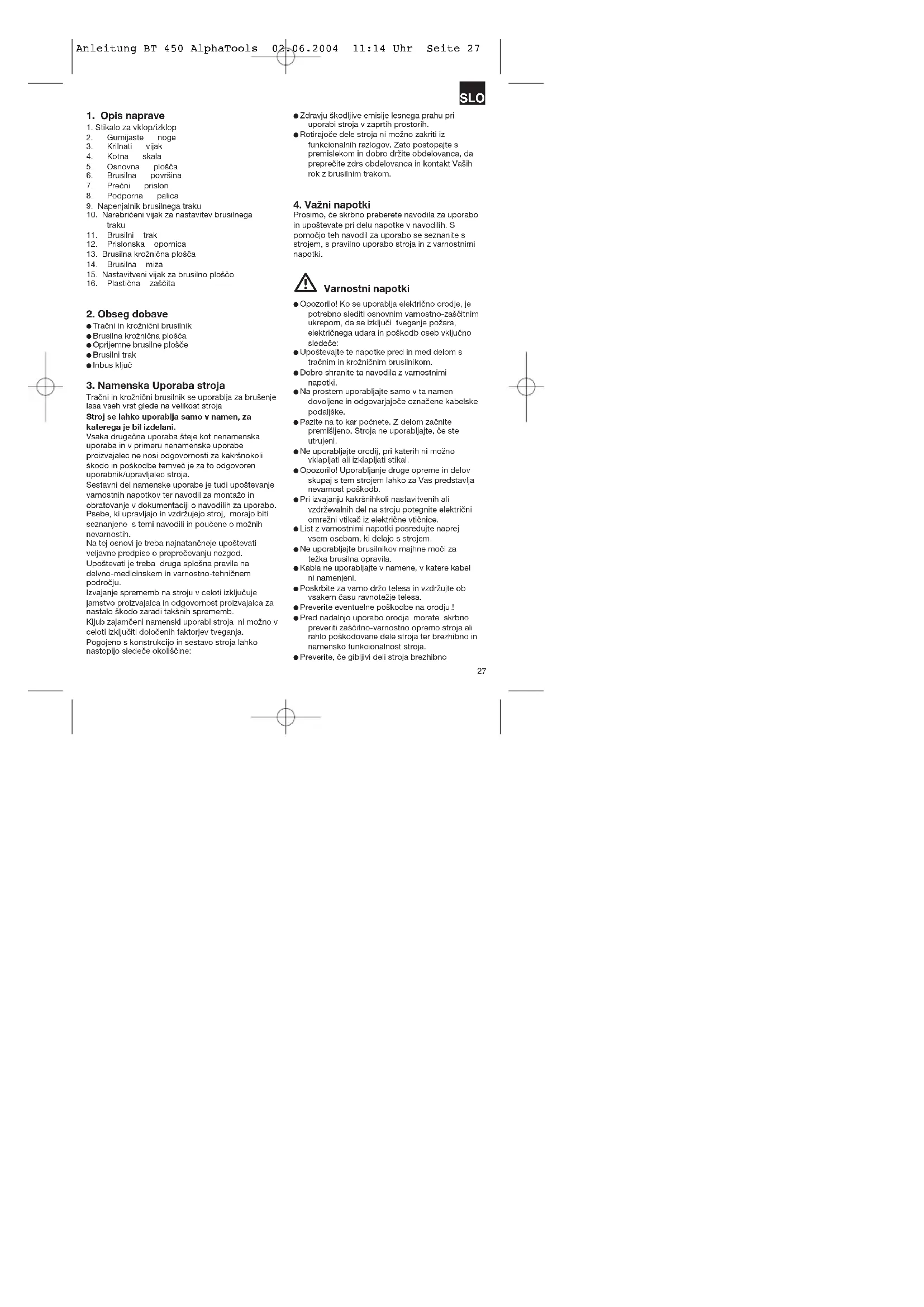 Prosimo, če skrbno preberete navodila za uporabo in upoštevate pri delu napotke v navodilih. S pomočjo teh navodil za uporabo se seznanite s strojem, s pravilno uporabo stroja in z varnostnimi napotki. Varnostni napotki Opozorilo! Ko se uporablja električno orodje, je potrebno slediti osnovnim varnostno-zaščitnim ukrepom, da se izključi tveganje požara, električnega udara in poškodb oseb vključno sledeče: Upoštevajte te napotke pred in med delom s tračnim in krožničnim brusilnikom. Dobro shranite ta navodila z varnostnimi napotki. Na prostem uporabljajte samo v ta namen dovoljene in odgovarjajoče označene kabelske podaljške. Pazite na to kar počnete. Z delom začnite premišljeno. Stroja ne uporabljajte, če ste utrujeni. Ne uporabljajte orodij, pri katerih ni možno vklapljati ali izklapljati stikal. Opozorilo! Uporabljanje druge opreme in delov skupaj s tem strojem lahko za Vas predstavlja nevarnost poškodb. Pri izvajanju kakršnihkoli nastavitvenih ali vzdrževalnih del na stroju potegnite električni omrežni vtikač iz električne vtičnice. List z varnostnimi napotki posredujte naprej vsem osebam, ki delajo s strojem. Ne uporabljajte brusilnikov majhne moči za težka brusilna opravila. Kabla ne uporabljajte v namene, v katere kabel ni namenjeni. Poskrbite za varno držo telesa in vzdržujte ob vsakem času ravnotežje telesa. Preverite eventuelne poškodbe na orodju.! Pred nadalnjo uporabo orodja morate skrbno preveriti zaščitno-varnostno opremo stroja ali rahlo poškodovane dele stroja ter brezhibno in namensko funkcionalnost stroja. Preverite, če gibljivi deli stroja brezhibno Anleitung BT 450 AlphaTools 02.06.2004 11:14 Uhr Seite 27SLO