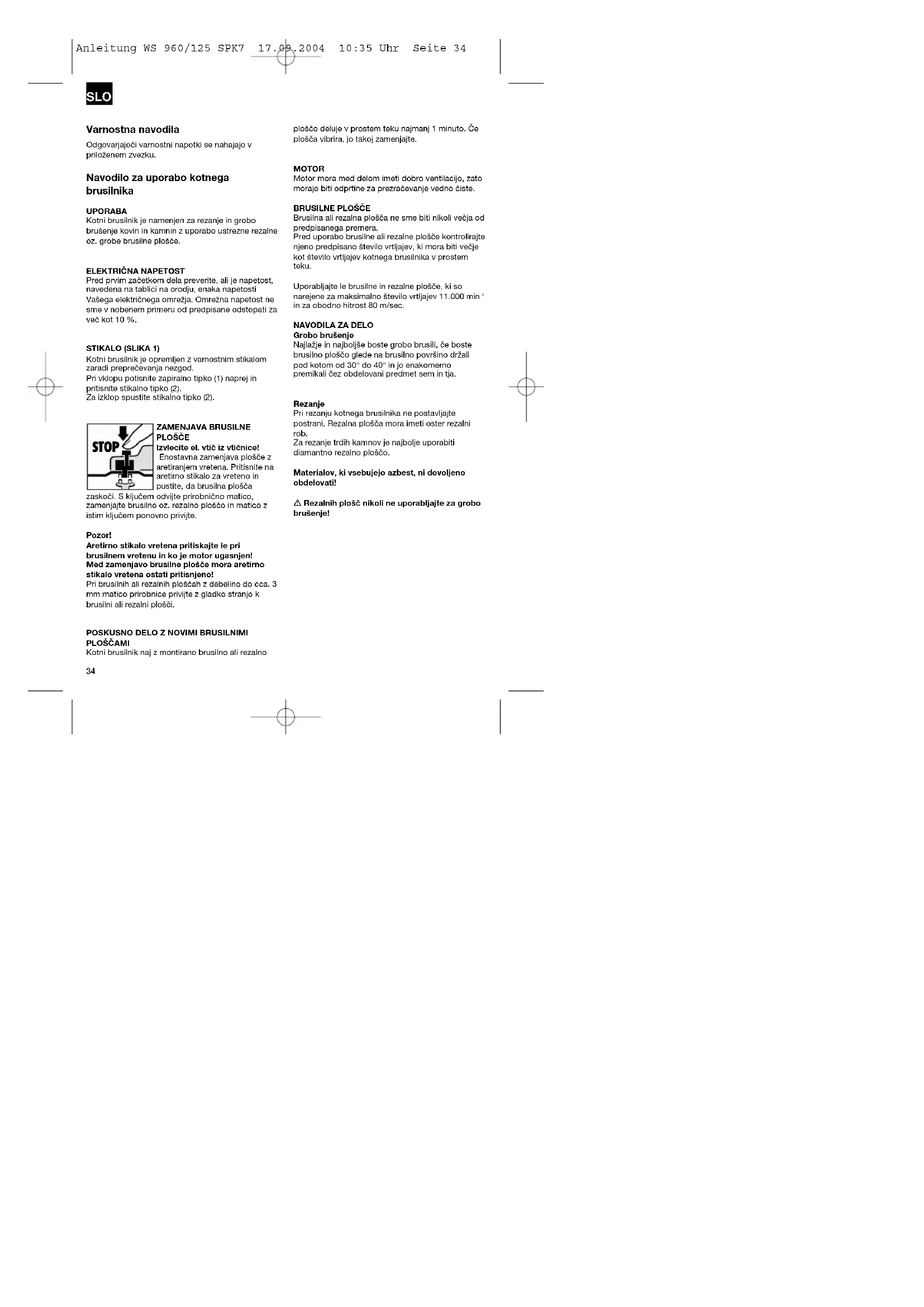 Grobo brušenje Najlažje in najboljše boste grobo brusili, če boste brusilno ploščo glede na brusilno površino držali pod kotom od 30° do 40° in jo enakomerno premikali čez obdelovani predmet sem in tja. Rezanje Pri rezanju kotnega brusilnika ne postavljajte postrani. Rezalna plošča mora imeti oster rezalni rob. Za rezanje trdih kamnov je najbolje uporabiti diamantno rezalno ploščo. Materialov, ki vsebujejo azbest, ni dovoljeno obdelovati! Rezalnih plošč nikoli ne uporabljajte za grobo brušenje! STOP Anleitung WS 960/125 SPK7 17.09.2004 10:35 Uhr Seite 34TEHNIČNI PODATKI Nazivna napetost: 230 V ~ 50 Hz Poraba: 960 W Število vrtljajev v prostem teku: 10.500 min