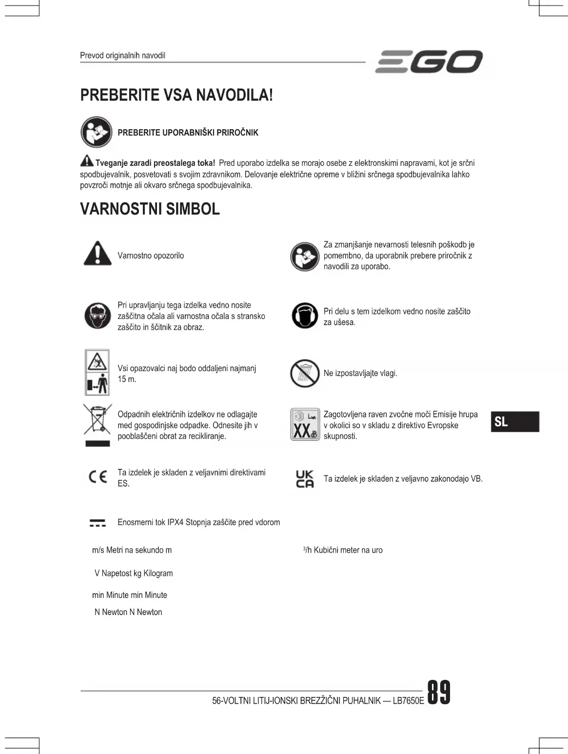 Zagotovljena raven zvočne moči Emisije hrupa v okolici so v skladu z direktivo Evropske skupnosti.Ta izdelek je skladen z veljavnimi direktivami ES. Ta izdelek je skladen z veljavno zakonodajo VB.Enosmerni tok IPX4 Stopnja zaščite pred vdoromm/s Metri na sekundo m /h Kubični meter na uroV Napetost kg Kilogrammin Minute min MinuteN Newton N NewtonPrevod originalnih navodil56-VOLTNI LITIJ-IONSKI BREZŽIČNI PUHALNIK — LB7650E90