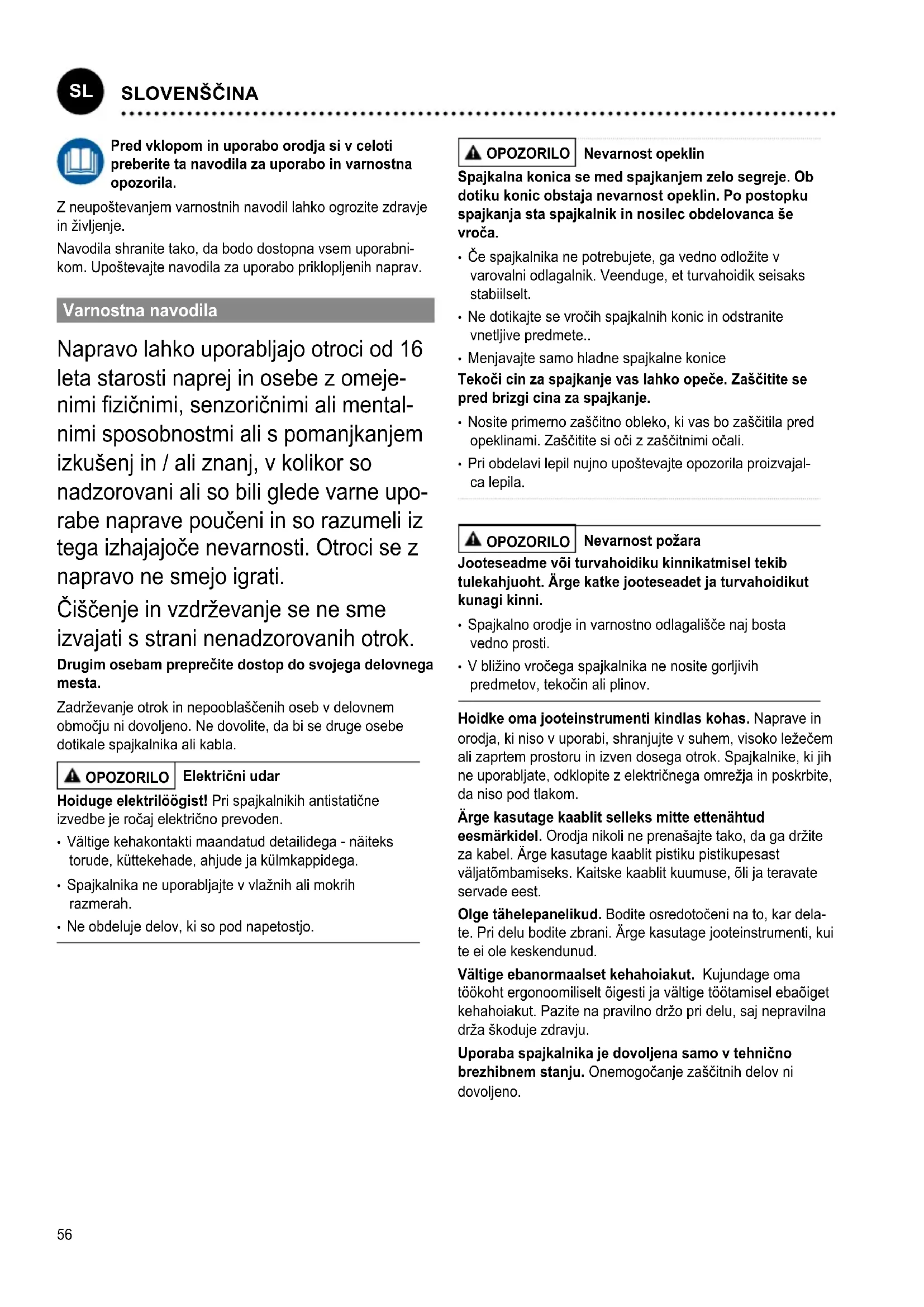 SLOVENSKY56 Pred vklopom in uporabo orodja si v celoti preberite ta navodila za uporabo in varnostna opozorila. Z neupoštevanjem varnostnih navodil lahko ogrozite zdravje in življenje. Navodila shranite tako, da bodo dostopna vsem uporabni- kom. Upoštevajte navodila za uporabo priklopljenih naprav. Varnostna navodila Napravo lahko uporabljajo otroci od 16 leta starosti naprej in osebe z omeje- nimi zičnimi, senzoričnimi ali mental- nimi sposobnostmi ali s pomanjkanjem izkušenj in / ali znanj, v kolikor so nadzorovani ali so bili glede varne upo- rabe naprave poučeni in so razumeli iz tega izhajajoče nevarnosti. Otroci se z napravo ne smejo igrati. Čiščenje in vzdrževanje se ne sme izvajati s strani nenadzorovanih otrok. Drugim osebam preprečite dostop do svojega delovnega mesta. Zadrževanje otrok in nepooblaščenih oseb v delovnem območju ni dovoljeno. Ne dovolite, da bi se druge osebe dotikale spajkalnika ali kabla. OPOZORILO Električni udar Hoiduge elektrilöögist! Pri spajkalnikih antistatične izvedbe je ročaj električno prevoden.
