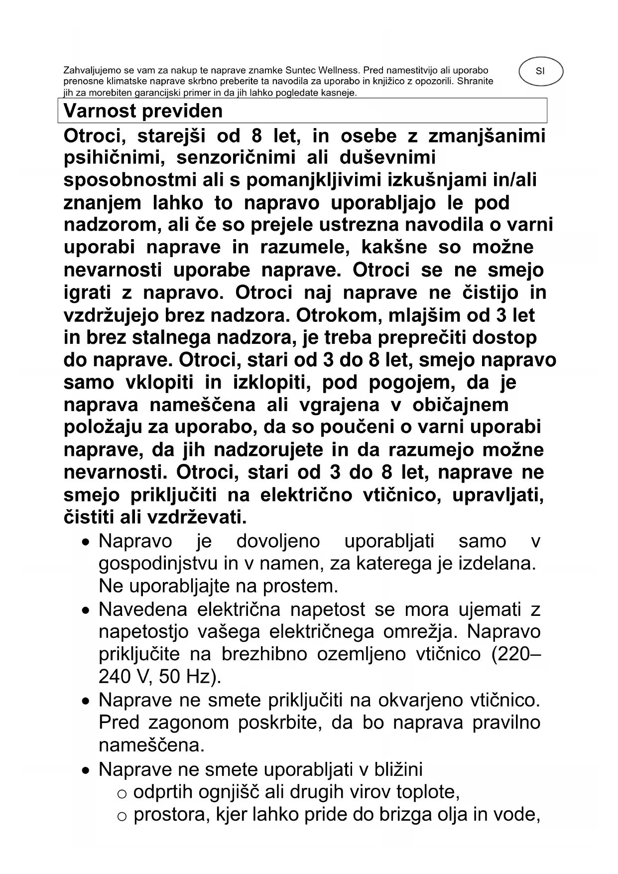 © 2023 KLIMATRONIC® Coolfixx 16000 BTU App SUNTEC WELLNESS GMBH / HOLZSTRASSE 2 / 40 221 DÜSSELDORF / GERMANYSI Zahvaljujemo se vam za nakup te naprave znamke Suntec Wellness. Pred namestitvijo ali uporabo prenosne klimatske naprave skrbno preberite ta navodila za uporabo in knjižico z opozorili. Shranite jih za morebiten garancijski primer in da jih lahko pogledate kasneje. Varnost previden Otroci, starejši od 8 let, in osebe z zmanjšanimi psihičnimi, senzoričnimi ali duševnimi sposobnostmi ali s pomanjkljivimi izkušnjami in/ali znanjem lahko to napravo uporabljajo le pod nadzorom, ali če so prejele ustrezna navodila o varni uporabi naprave in razumele, kakšne so možne nevarnosti uporabe naprave. Otroci se ne smejo igrati z napravo. Otroci naj naprave ne čistijo in vzdržujejo brez nadzora. Otrokom, mlajšim od 3 let in brez stalnega nadzora, je treba preprečiti dostop do naprave. Otroci, stari od 3 do 8 let, smejo napravo samo vklopiti in izklopiti, pod pogojem, da je naprava nameščena ali vgrajena v običajnem položaju za uporabo, da so poučeni o varni uporabi naprave, da jih nadzorujete in da razumejo možne nevarnosti. Otroci, stari od 3 do 8 let, naprave ne smejo priključiti na električno vtičnico, upravljati, čistiti ali vzdrževati.