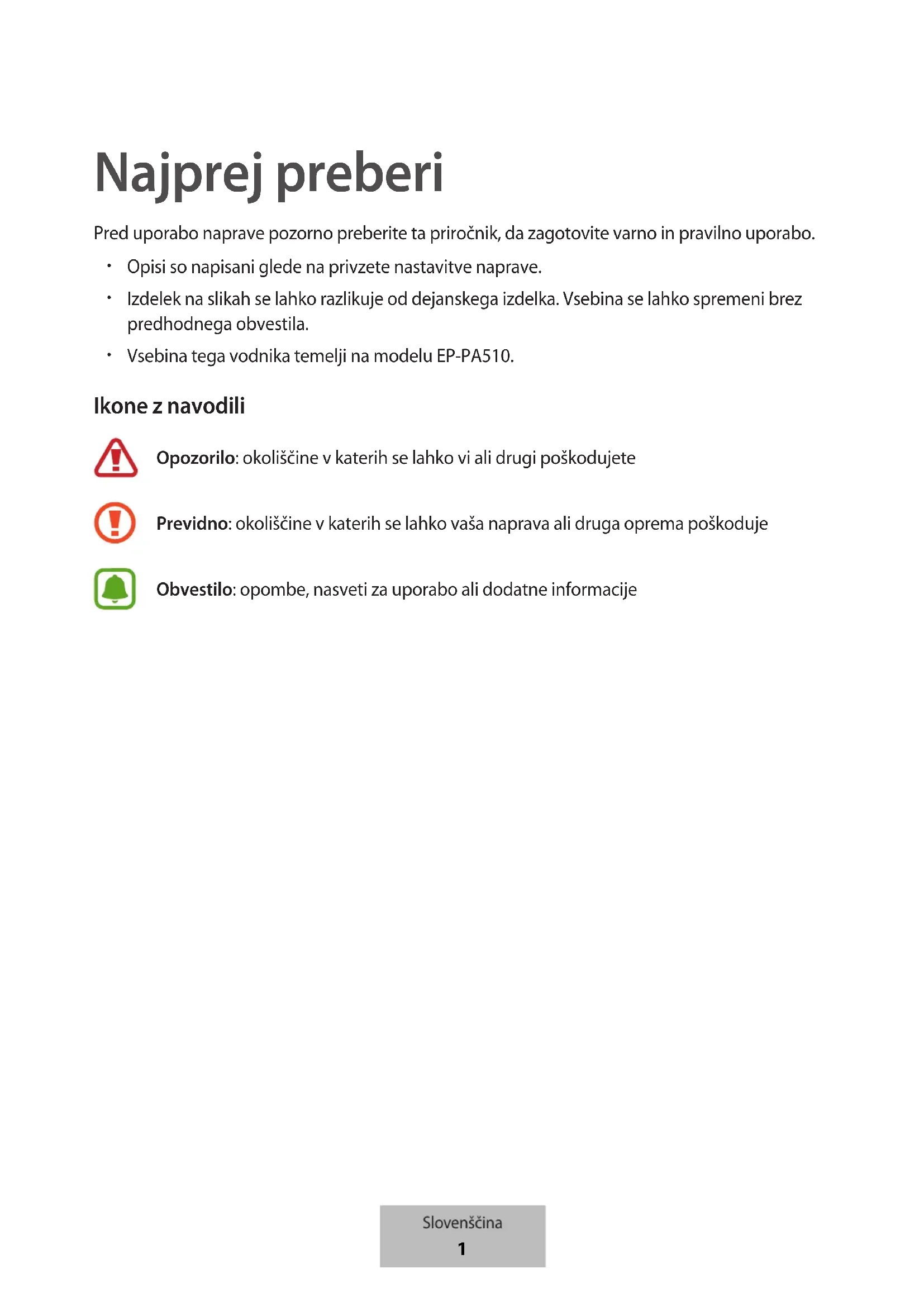 Vsebina tega vodnika temelji na modelu EP-PA510. Ikone z navodili Opozorilo: okoliščine v katerih se lahko vi ali drugi poškodujete Previdno: okoliščine v katerih se lahko vaša naprava ali druga oprema poškoduje Obvestilo: opombe, nasveti za uporabo ali dodatne informacije Slovenščina