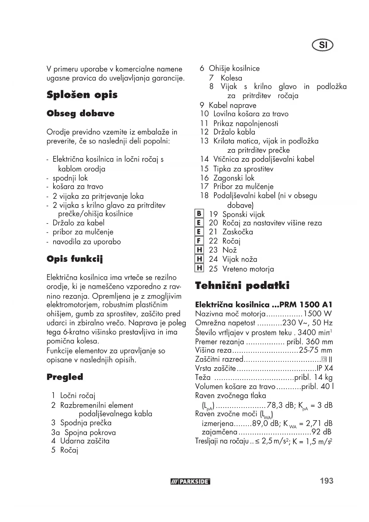 V primeru uporabe v komercialne namene ugasne pravica do uveljavljanja garancije. Splošen opis Obseg dobave Orodje previdno vzemite iz embalaže in preverite, če so naslednji deli popolni: - Električna kosilnica in ločni ročaj s kablom orodja - spodnji lok - košara za travo - 2 vijaka za pritrjevanje loka - 2 vijaka s krilno glavo za pritrditev prečke/ohišja kosilnice - Držalo za kabel - pribor za mulčenje - navodila za uporabo Opis funkcij Električna kosilnica ima vrteče se rezilno orodje, ki je nameščeno vzporedno z rav- nino rezanja. Opremljena je z zmogljivim elektromotorjem, robustnim plastičnim ohišjem, gumb za sprostitev, zaščito pred udarci in zbiralno vrečo. Naprava je poleg tega 6-kratno višinsko prestavljiva in ima pomična kolesa. Funkcije elementov za upravljanje so opisane v naslednjih opisih. Pregled 1 Ločni ročaj 2 Razbremenilni element podaljševalnega kabla 3 Spodnja prečka 3a Spojna pokrova 4 Udarna zaščita 5 Ročaj194