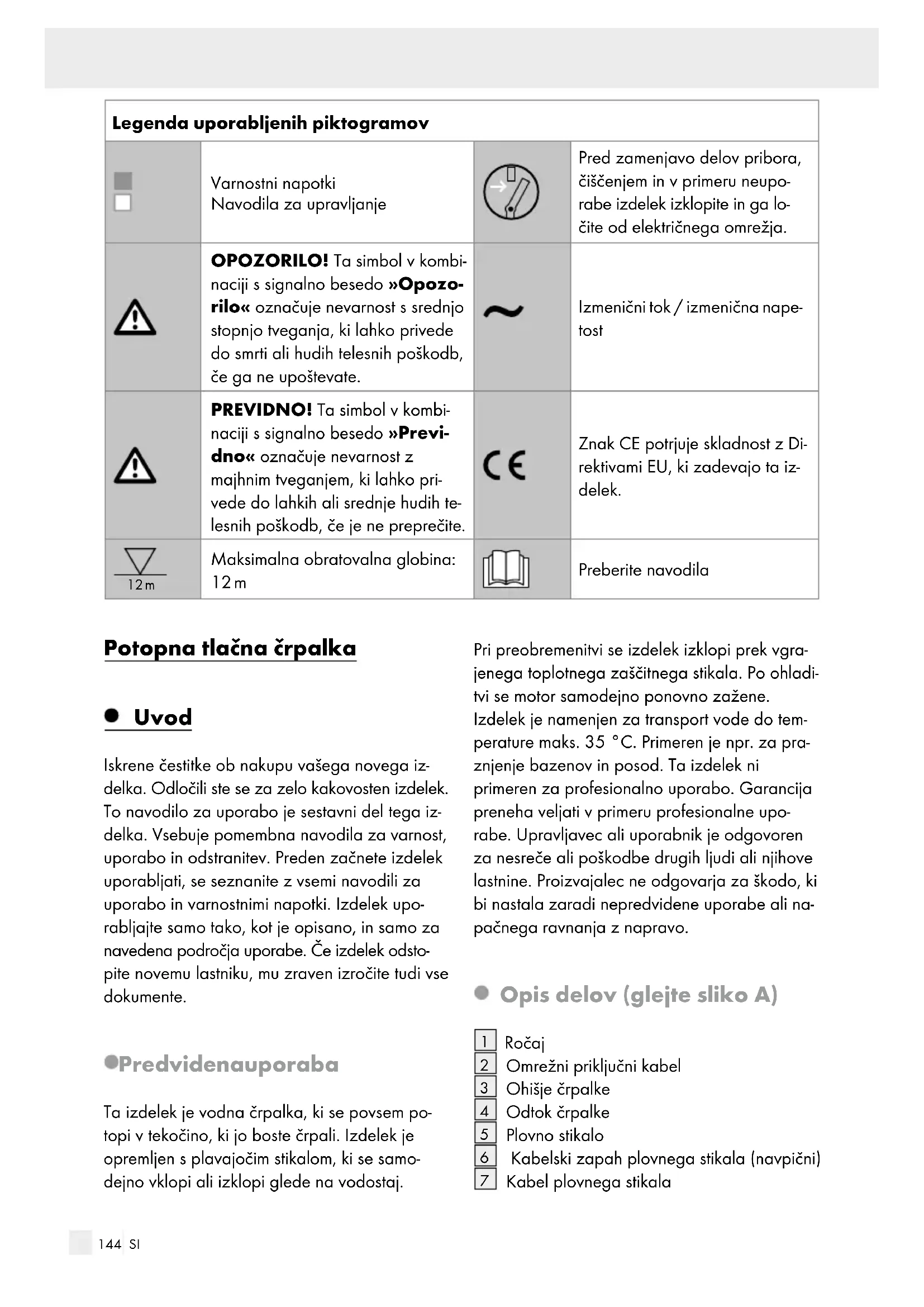 MENTE! OPOZORILO! Ta simbol v kombinaciji s signalno besedo »Opozorilo« označuje nevarnost s sre- dnjo stopnjo tveganja, ki lahko privede do smrti ali hudih telesnih poškodb, če ga ne upoštevate. PREVIDNO! Ta simbol v kombinaciji s signalno besedo »Previdno« označuje nevarnost z majhnim tveganjem, ki lahko privede do lahkih ali srednje hudih telesnih poškodb, če je ne prepre- čite. 12 m Maksimalna obratovalna globina: 12 m Pred zamenjavo delov pribora, čiščenjem in v primeru neuporabe izde- lek izklopite in ga ločite od električnega omrežja.