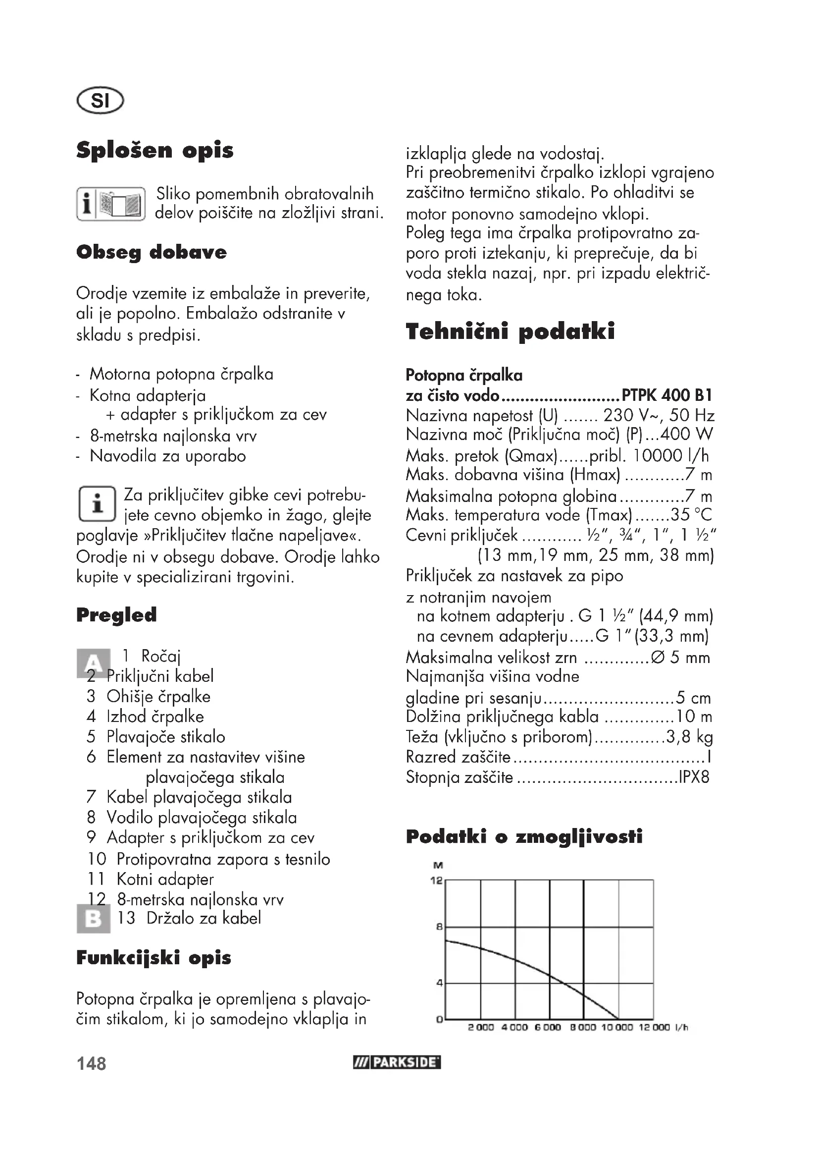 izklaplja glede na vodostaj. Pri preobremenitvi črpalko izklopi vgrajeno zaščitno termično stikalo. Po ohladitvi se motor ponovno samodejno vklopi. Poleg tega ima črpalka protipovratno za- poro proti iztekanju, ki preprečuje, da bi voda stekla nazaj, npr. pri izpadu električ- nega toka. Tehnični podatki Potopna črpalka za čisto vodo ......................... PTPK 400 B1 Nazivna napetost (U) ....... 230 V~, 50 Hz Nazivna moč (Priključna moč) (P) ...400 W Maks. pretok (Qmax) ...... pribl. 10000 l/h Maks. dobavna višina (Hmax) ............7 m Maksimalna potopna globina .............7 m Maks. temperatura vode (Tmax) .......35 °C Cevni priključek ............ ½“, ¾“, 1“, 1 ½“ (13mm,19mm, 25mm, 38mm) Priključek za nastavek za pipo z notranjim navojem na kotnem adapterju . G1 ½“ (44,9mm) na cevnem adapterju ..... G1“ (33,3mm) Maksimalna velikost zrn ............. Ø 5 mm Najmanjša višina vodne gladine pri sesanju .......................... 5 cm Dolžina priključnega kabla ..............10 m Teža (vključno s priborom) ............. .3,8 kg Razred zaščite ...................................... I Stopnja zaščite ................................IPX8 Podatki o zmogljivosti Splošen opis Sliko pomembnih obratovalnih delov poiščite na zložljivi strani. Obseg dobave Orodje vzemite iz embalaže in preverite, ali je popolno. Embalažo odstranite v skladu s predpisi. - Motorna potopna črpalka - Kotna adapterja + adapter s priključkom za cev - 8-metrska najlonska vrv - Navodila za uporabo Za priključitev gibke cevi potrebu- jete cevno objemko in žago, glejte poglavje »Priključitev tlačne napeljave«. Orodje ni v obsegu dobave. Orodje lahko kupite v specializirani trgovini. Pregled 1 Ročaj 2 Priključni kabel 3 Ohišje črpalke 4 Izhod črpalke 5 Plavajoče stikalo 6 Element za nastavitev višine plavajočega stikala 7 Kabel plavajočega stikala 8 Vodilo plavajočega stikala 9 Adapter s priključkom za cev 10 Protipovratna zapora s tesnilo 11 Kotni adapter 12 8-metrska najlonska vrv 13 Držalo za kabel Funkcijski opis Potopna črpalka je opremljena s plavajo- čim stikalom, ki jo samodejno vklaplja in149