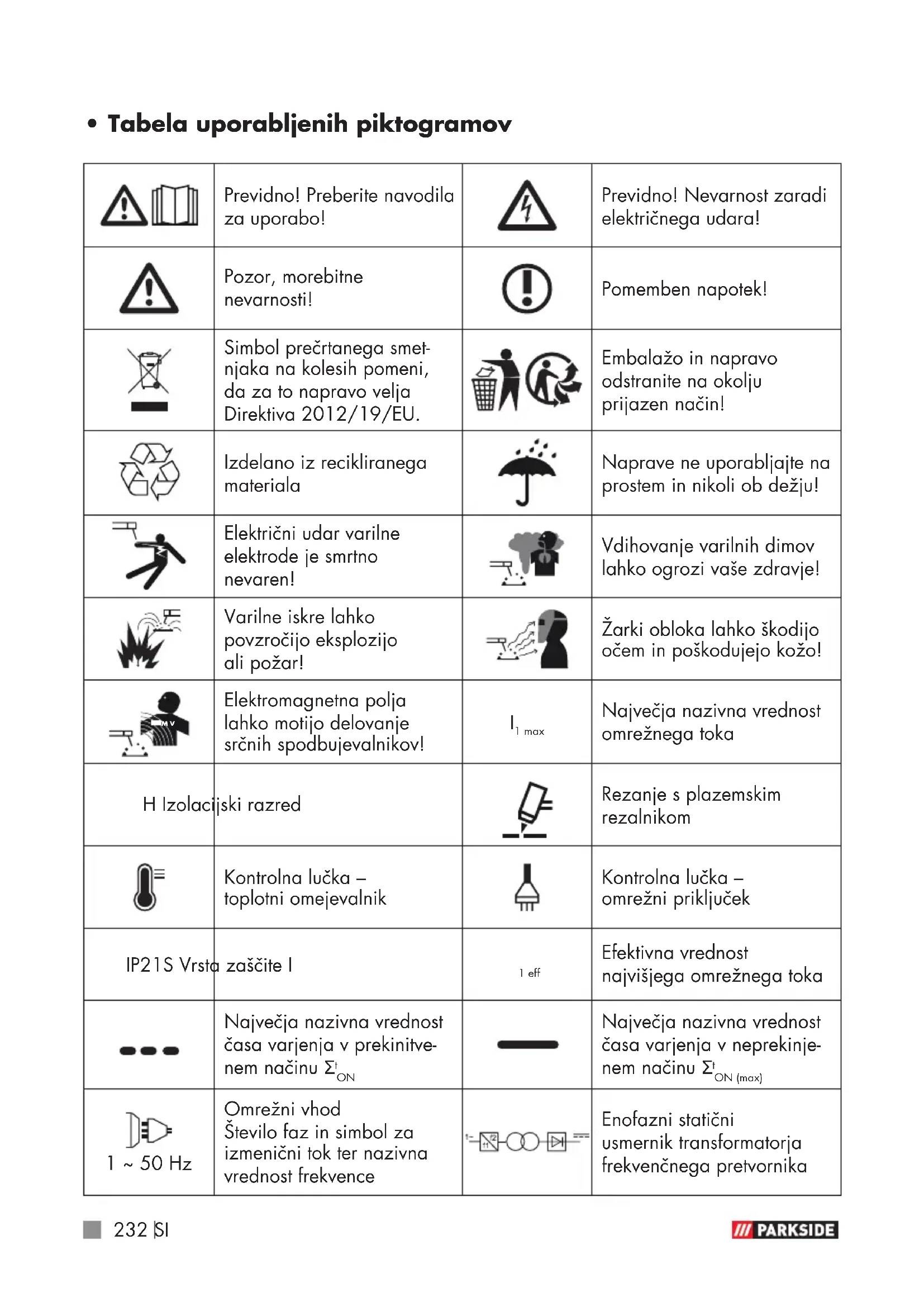 - Tabela uporabljenih piktogramov Previdno! Preberite navodila za uporabo! Previdno! Nevarnost zaradi električnega udara! Pozor, morebitne nevarnosti! Pomemben napotek! Simbol prečrtanega smet- njaka na kolesih pomeni, da za to napravo velja Direktiva 2012/19/EU. Embalažo in napravo odstranite na okolju prijazen način! Izdelano iz recikliranega materiala Naprave ne uporabljajte na prostem in nikoli ob dežju! Električni udar varilne elektrode je smrtno nevaren! Vdihovanje varilnih dimov lahko ogrozi vaše zdravje! Varilne iskre lahko povzročijo eksplozijo ali požar! Žarki obloka lahko škodijo očem in poškodujejo kožo!