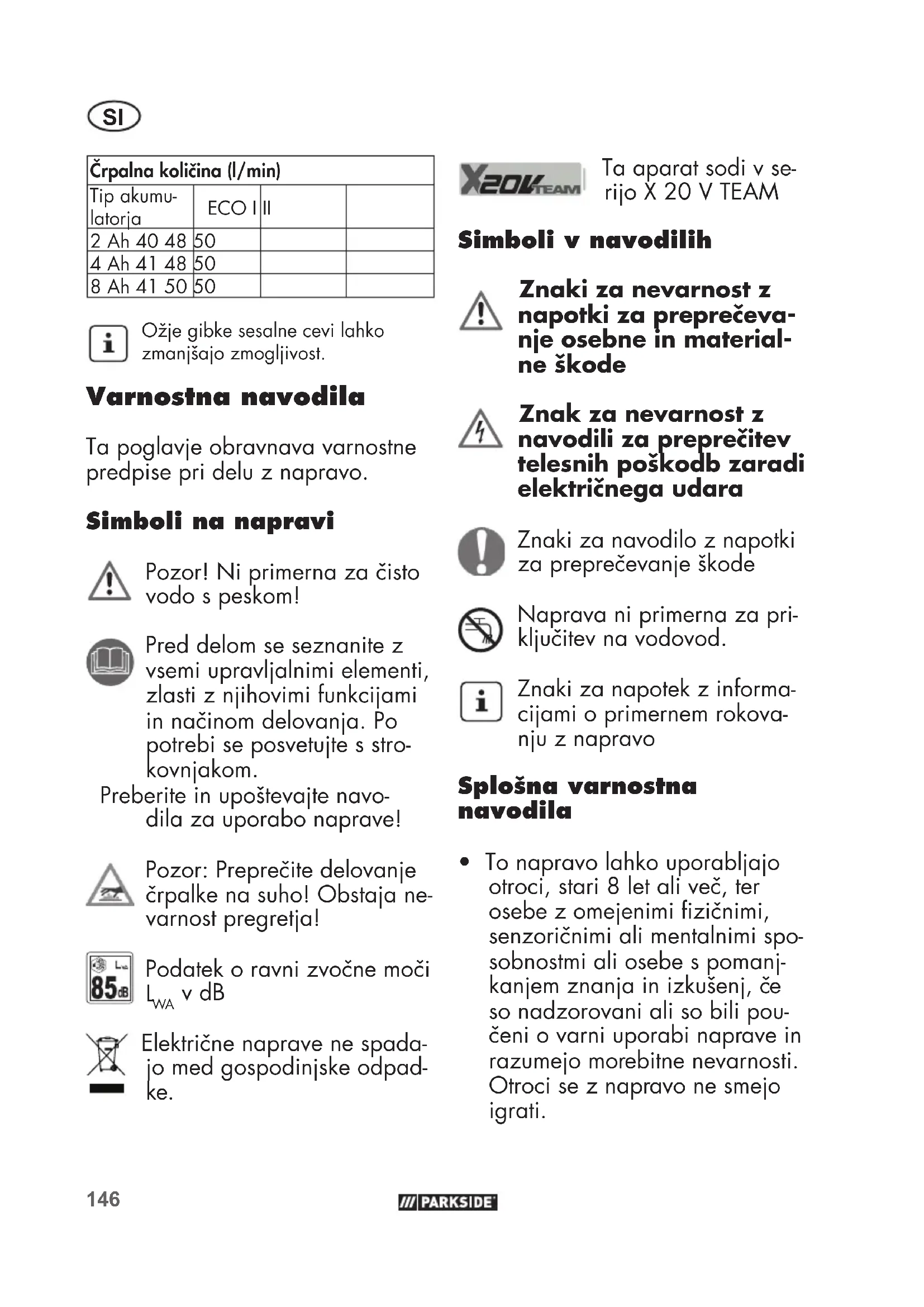 v dB Električne naprave ne spada- jo med gospodinjske odpad- ke. Ta aparat sodi v se- rijo X20VTEAM Simboli v navodilih Znaki za nevarnost z napotki za preprečeva- nje osebne in material- ne škode Znak za nevarnost z navodili za preprečitev telesnih poškodb zaradi električnega udara Znaki za navodilo z napotki za preprečevanje škode Naprava ni primerna za pri- ključitev na vodovod. Znaki za napotek z informa- cijami o primernem rokova- nju z napravo Splošna varnostna navodila