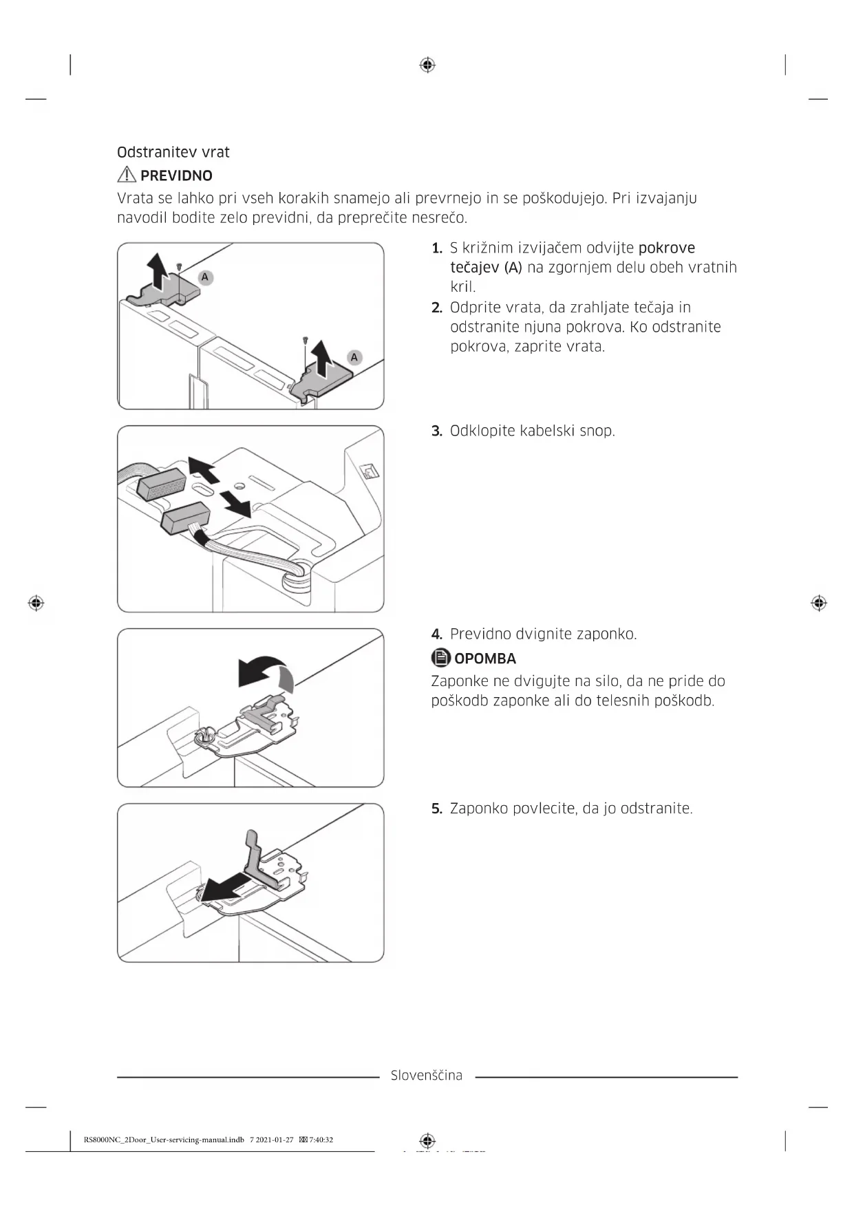 prozorno spojko (A) ter snemite cev za vodo (B). PREVIDNO Pri delu s spojko ne uporabljajte pretirane sile. Lahko bi se zlomila. RS8000NC_2Door_User-servicing-manual.indb 6 2021-01-27 7:40:32Slovenščina Odstranitev vrat PREVIDNO Vrata se lahko pri vseh korakih snamejo ali prevrnejo in se poškodujejo. Pri izvajanju navodil bodite zelo previdni, da preprečite nesrečo.
