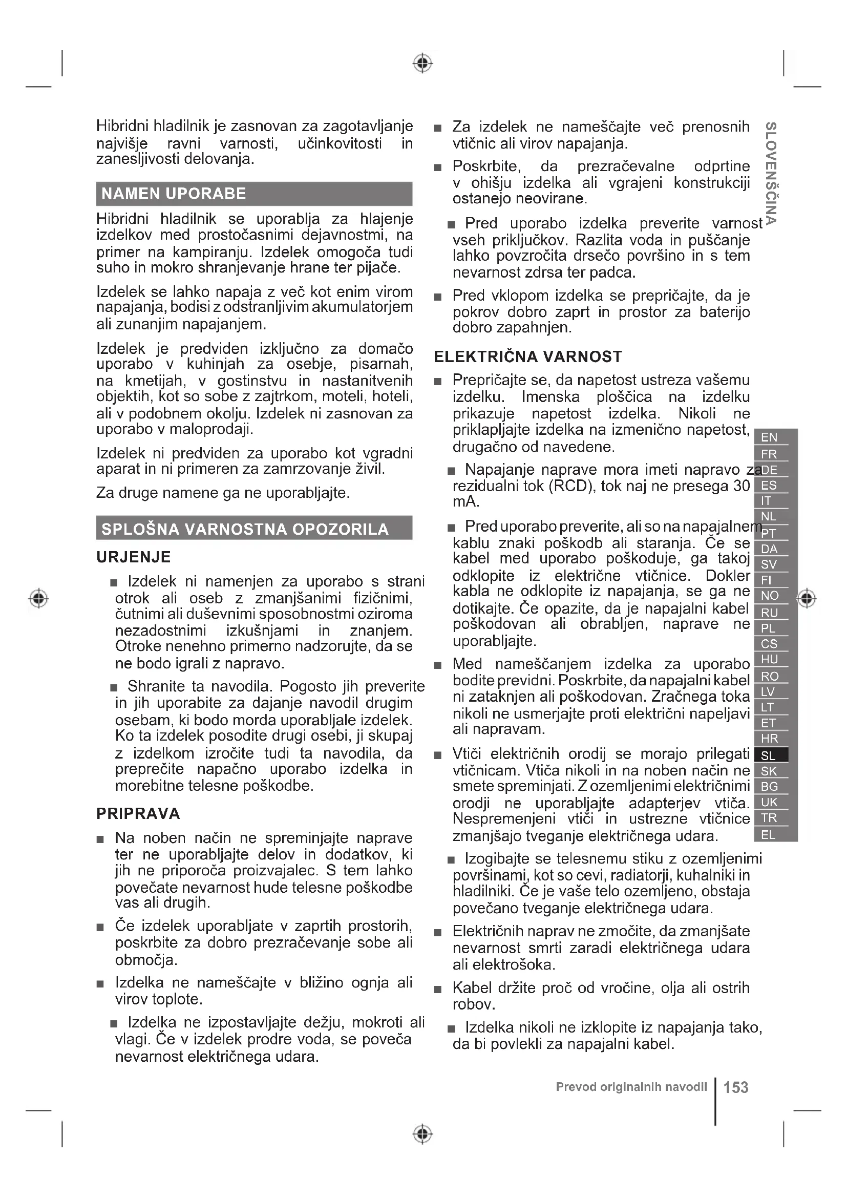 Hibridni hladilnik je zasnovan za zagotavljanje najvišje ravni varnosti, učinkovitosti in zanesljivosti delovanja. NAMEN UPORABE Hibridni hladilnik se uporablja za hlajenje izdelkov med prostočasnimi dejavnostmi, na primer na kampiranju. Izdelek omogoča tudi suho in mokro shranjevanje hrane ter pijače. Izdelek se lahko napaja z več kot enim virom napajanja, bodisi z odstranljivim akumulatorjem ali zunanjim napajanjem. Izdelek je predviden izključno za domačo uporabo v kuhinjah za osebje, pisarnah, na kmetijah, v gostinstvu in nastanitvenih objektih, kot so sobe z zajtrkom, moteli, hoteli, ali v podobnem okolju. Izdelek ni zasnovan za uporabo v maloprodaji. Izdelek ni predviden za uporabo kot vgradni aparat in ni primeren za zamrzovanje živil. Za druge namene ga ne uporabljajte.