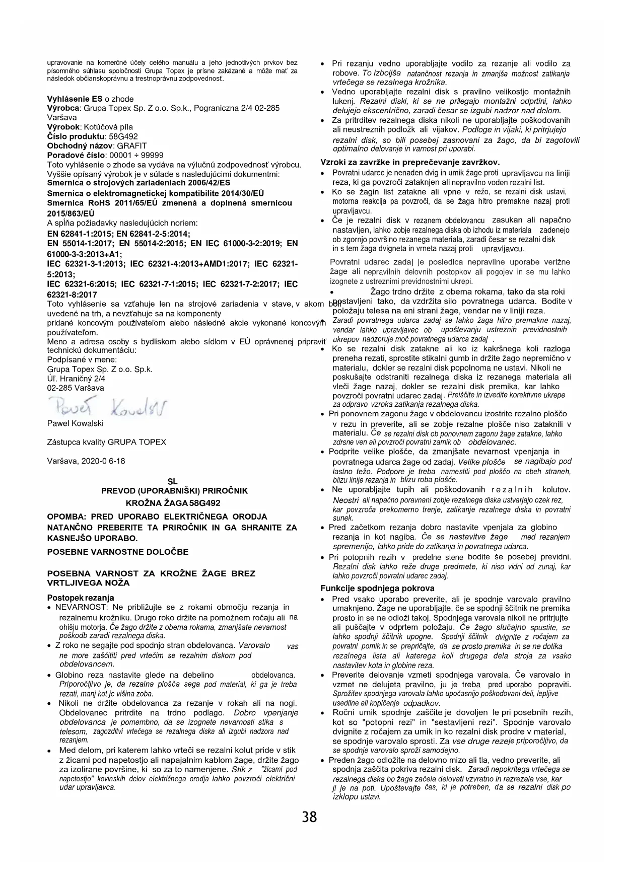 Izdelkov na električni pogon ne smete odlagati skupaj z gospodinjskimi odpadki, temveč jih je treba odnesti v ustrezne prostore za odstranjevanje. Za informacije o odstranjevanju se obrnite na prodajalca izdelka ali lokalne oblasti. Odpadna električna in elektronska oprema vsebuje snovi, ki niso okolju prijazne. Oprema, ki ni reciklirana, predstavlja potencialno tveganje za okolje in zdravje ljudi. "Grupa Topex Spółka z ograniczoną odpowiedzialnością" Spółka komandytowa s sedežem v Varšavi, ul. Pograniczna 2/4 (v nadaljevanju: "Grupa Topex") obvešča, da so vse avtorske pravice na vsebini tega priročnika (v nadaljevanju: "Priročnik"), med drugim tudi. njegovo besedilo, fotografije, diagrame, risbe in sestavo, pripadajo izključno družbi Grupa Topex in so predmet pravnega varstva v skladu z Zakonom z dne 4. februarja 1994 o avtorski in sorodnih pravicah (tj. Ur. l. 2006, št. 90 Poz. 631, s spremembami). Kopiranje, obdelava, objava, spreminjanje celotnega priročnika in njegovih posameznih elementov v komercialne namene brez pisnega soglasja družbe Grupa Topex je strogo prepovedano in lahko povzroči civilno in kazensko odgovornost. ES izjava o skladnosti Proizvajalec: Grupa Topex Sp. Z o.o. Sp.k., Pograniczna 2/4 02-285 Varšava Izdelek: Krožna žaga Št. izdelka: 58G492 Trgovsko ime: GRAPHITE Serijska številka: 00001 ÷ 99999 Ta izjava o skladnosti se izda izključno pod odgovornostjo proizvajalca. Zgoraj opisani izdelek je v skladu z naslednjimi dokumenti: Direktiva o strojih 2006/42/ES Direktiva o elektromagnetni združljivosti 2014/30/EU Direktiva RoHS 2011/65/EU, kakor je bila spremenjena z Direktivo 2015/863/EU In izpolnjuje zahteve naslednjih standardov: SL 62841-1:2015; SL 62841-2-5:2014;42 SL 55014-1:2017; SL 55014-2:2015; SL IEC 61000-3-2:2019; SL 61000-3-3:2013+A1; IEC 62321-3-1:2013; IEC 62321-4:2013+AMD1:2017; IEC 62321- 5:2013; IEC 62321-6:2015; IEC 62321-7-1:2015; IEC 62321-7-2:2017; IEC 62321-8:2017 Ta izjava se nanaša le na stroje v stanju, v katerem je bila dana na trg in ne zajema sestavnih delov končni uporabnik ali naslednja dejanja, ki jih izvede končni uporabnik. Ime in naslov osebe s prebivališčem ali sedežem v EU, pooblaščene za pripravo tehnične dokumentacije: Podpisano v imenu: Grupa Topex Sp. Z o.o. Sp.k. Panj. Mejna meja 2/4 02-285 Varšava Pawel Kowalski Predstavnik kakovosti grupe TOPEX Varšava, 2020-0 6-18