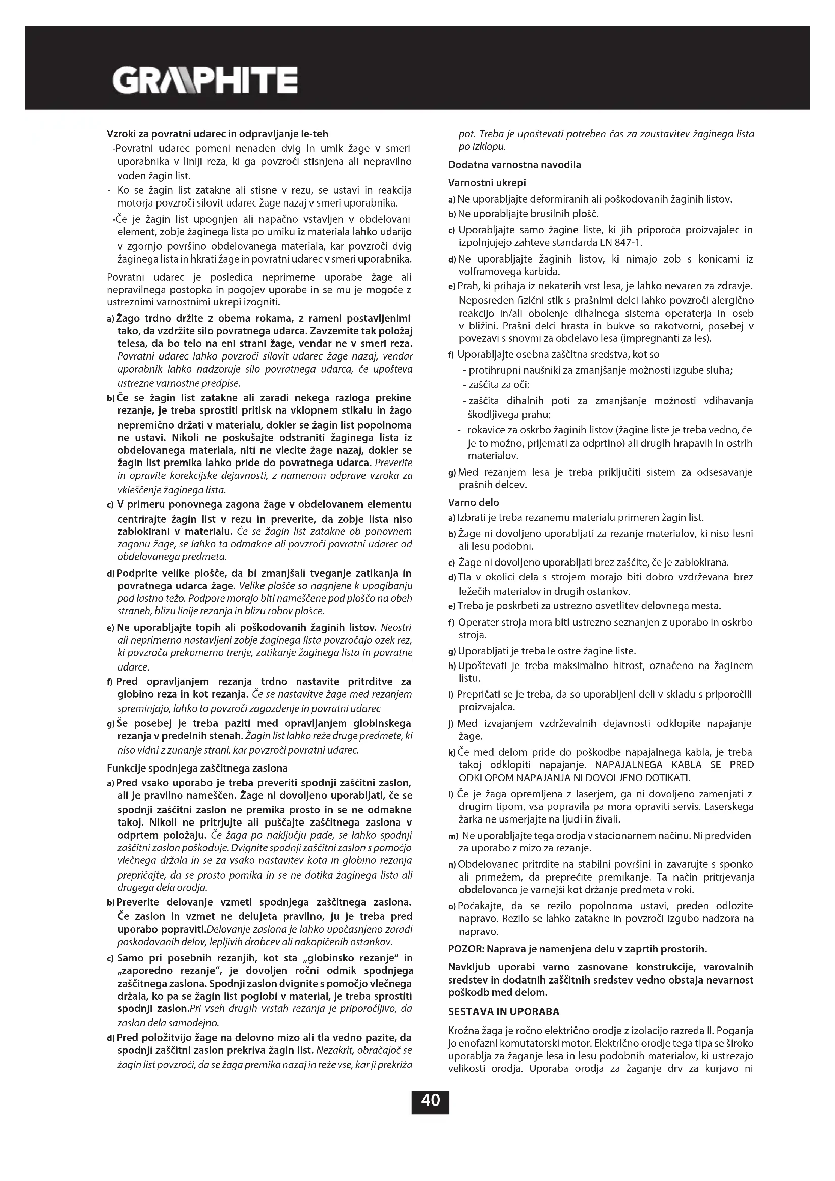 Postopek rezanja a) NEVARNOST: Roke držite stran od območja rezanja in žaginega lista. Drugo roko držite na pomožnem ročaju ali na ohišju motorja. Če z obema rokama držite žago, se zmanjša tveganje poškodbe z žaginim listom. b) Z roko ne segajte pod obdelovani predmet. Zaščita vas pod obdelovanim predmetom ne bo obvarovala pred žaginim listom. c) Nastavite globino reza v skladu z debelino obdelovanega predmeta. Priporočljivo je, da žagin list manj kot za višino zoba moli izpod rezanega materiala. d) Obdelovanega predmeta nikoli ne držite v rokah ali na nogi. Obdelovani predmet pričvrstite v trdno stojalo. Dobra pričvrstitev obdelovanega predmeta je pomembna, da ne bi prišlo do nevarnega stika s telesom, zagozditve vrtečega žaginega lista ali izgube nadzora nad rezanjem. e) Žago med delom držite za zato namenjene izolirane površine; pri delu lahko pride do stika med obračajočim se žaginimi listom in kablom pod napetostjo ali napajalnim kablom žage. V primeru, da pride do stika kovinskih delov električnega orodja s kablom pod napetostjo, lahko pride do električnega udara na uporabniku. f) Med vzdolžnim rezanjem je treba vedno uporabljati vodilo za vzdolžno rezanje ali vodilo za robove. To izboljša natančnost reza in zmanjša možnost zagozditve obračajočega se žaginega lista. g) Vedno uporabljajte žagin list pravilnih dimenzij za vpenjalno odprtino. Žagini listi, ki ne ustrezajo vpenjalni odprtini, lahko delujejo ekscentrično, kar povzroči izgubo nadzora nad delom. h) Nikoli ne pritrdite poškodovanih žaginih listov ali neustreznih podložk ali vijakov. Pritrdilne podložke in vijaki za žagine liste so izdelani posebej za žago, da bi zagotovili optimalno delovanje in varno uporabo. SL40 Vzroki za povratni udarec in odpravljanje le-teh - Povratni udarec pomeni nenaden dvig in umik žage v smeri uporabnika v liniji reza, ki ga povzroči stisnjena ali nepravilno voden žagin list. - Ko se žagin list zatakne ali stisne v rezu, se ustavi in reakcija motorja povzroči silovit udarec žage nazaj v smeri uporabnika. - Če je žagin list upognjen ali napačno vstavljen v obdelovani element, zobje žaginega lista po umiku iz materiala lahko udarijo v zgornjo površino obdelovanega materiala, kar povzroči dvig žaginega lista in hkrati žage in povratni udarec v smeri uporabnika. Povratni udarec je posledica neprimerne uporabe žage ali nepravilnega postopka in pogojev uporabe in se mu je mogoče z ustreznimi varnostnimi ukrepi izogniti. a) Žago trdno držite z obema rokama, z rameni postavljenimi tako, da vzdržite silo povratnega udarca. Zavzemite tak položaj telesa, da bo telo na eni strani žage, vendar ne v smeri reza. Povratni udarec lahko povzroči silovit udarec žage nazaj, vendar uporabnik lahko nadzoruje silo povratnega udarca, če upošteva ustrezne varnostne predpise. b) Če se žagin list zatakne ali zaradi nekega razloga prekine rezanje, je treba sprostiti pritisk na vklopnem stikalu in žago nepremično držati v materialu, dokler se žagin list popolnoma ne ustavi. Nikoli ne poskušajte odstraniti žaginega lista iz obdelovanega materiala, niti ne vlecite žage nazaj, dokler se žagin list premika lahko pride do povratnega udarca. Preverite in opravite korekcijske dejavnosti, z namenom odprave vzroka za vkleščenje žaginega lista. c) V primeru ponovnega zagona žage v obdelovanem elementu centrirajte žagin list v rezu in preverite, da zobje lista niso zablokirani v materialu. Če se žagin list zatakne ob ponovnem zagonu žage, se lahko ta odmakne ali povzroči povratni udarec od obdelovanega predmeta. d) Podprite velike plošče, da bi zmanjšali tveganje zatikanja in povratnega udarca žage. Velike plošče so nagnjene k upogibanju pod lastno težo. Podpore morajo biti nameščene pod ploščo na obeh straneh, blizu linije rezanja in blizu robov plošče. e) Ne uporabljajte topih ali poškodovanih žaginih listov. Neostri ali neprimerno nastavljeni zobje žaginega lista povzročajo ozek rez, ki povzroča prekomerno trenje, zatikanje žaginega lista in povratne udarce. f) Pred opravljanjem rezanja trdno nastavite pritrditve za globino reza in kot rezanja. Če se nastavitve žage med rezanjem spreminjajo, lahko to povzroči zagozdenje in povratni udarec g) Še posebej je treba paziti med opravljanjem globinskega rezanja v predelnih stenah. Žagin list lahko reže druge predmete, ki niso vidni z zunanje strani, kar povzroči povratni udarec. Funkcije spodnjega zaščitnega zaslona a) Pred vsako uporabo je treba preveriti spodnji zaščitni zaslon, ali je pravilno nameščen. Žage ni dovoljeno uporabljati, če se spodnji zaščitni zaslon ne premika prosto in se ne odmakne takoj. Nikoli ne pritrjujte ali puščajte zaščitnega zaslona v odprtem položaju. Če žaga po naključju pade, se lahko spodnji zaščitni zaslon poškoduje. Dvignite spodnji zaščitni zaslon s pomočjo vlečnega držala in se za vsako nastavitev kota in globino rezanja prepričajte, da se prosto pomika in se ne dotika žaginega lista ali drugega dela orodja. b) Preverite delovanje vzmeti spodnjega zaščitnega zaslona. Če zaslon in vzmet ne delujeta pravilno, ju je treba pred uporabo popraviti.Delovanje zaslona je lahko upočasnjeno zaradi poškodovanih delov, lepljivih drobcev ali nakopičenih ostankov. c) Samo pri posebnih rezanjih, kot sta „globinsko rezanje“ in „zaporedno rezanje“, je dovoljen ročni odmik spodnjega zaščitnega zaslona. Spodnji zaslon dvignite s pomočjo vlečnega držala, ko pa se žagin list poglobi v material, je treba sprostiti spodnji zaslon.Pri vseh drugih vrstah rezanja je priporočljivo, da zaslon dela samodejno. d) Pred položitvijo žage na delovno mizo ali tla vedno pazite, da spodnji zaščitni zaslon prekriva žagin list. Nezakrit, obračajoč se žagin list povzroči, da se žaga premika nazaj in reže vse, kar ji prekriža pot. Treba je upoštevati potreben čas za zaustavitev žaginega lista po izklopu. Dodatn