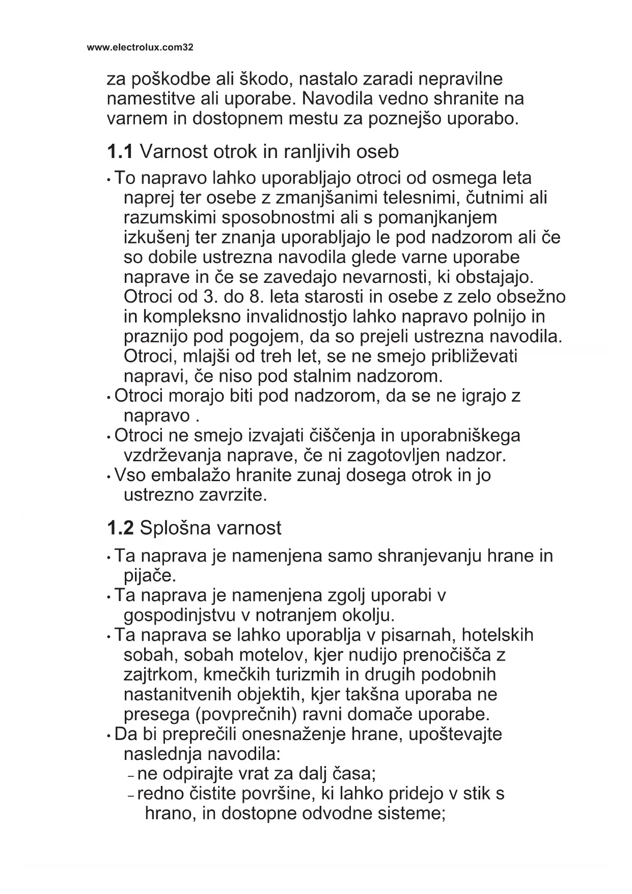 - Da bi preprečili onesnaženje hrane, upoštevajte naslednja navodila: – ne odpirajte vrat za dalj časa; – redno čistite površine, ki lahko pridejo v stik s hrano, in dostopne odvodne sisteme; www.electrolux.com32– surovo meso in ribe shranjujte v primernih posodah v hladilniku, tako da ne bodo v stiku z drugimi živili in njihovi sokovi ne bodo kapljali na druga živila.
