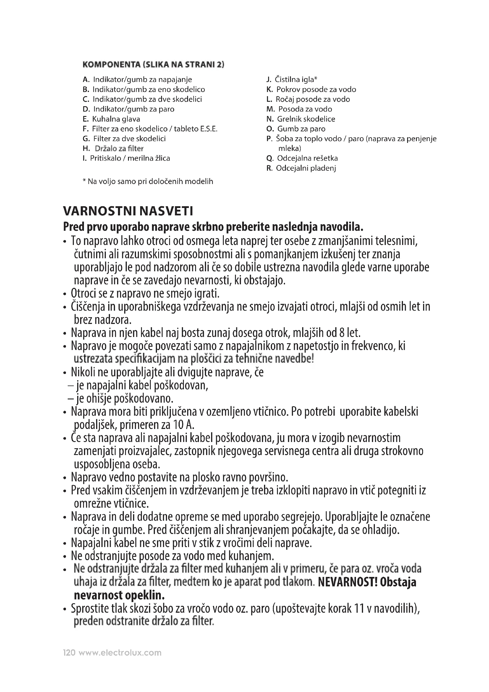 Voda pušča iz spodnjega dela kavnega aparata. V odcejalnem pladnju je preveč vode. Očistite odcejalni pladenj. Kavni aparat ne deluje pravilno. Za popravilo se obrnite na pooblaščeni servis. je ta zaskočen v kuhalni glavi. Počistite kavni prah na robu Kava espresso ima kisel okus (po kisu). Odstranjevanje vodnega kamna ni bilo pravilno izvedeno Očistite napravo skladno s koraki 1–4 za“prvi zagon naprave“ Kavni prah je bil dolgo shranjen na toplem in vlažnem mestu. Kavni prah se je pokvaril. Uporabljajte svež kavni prah oziroma hranite neuporabljen kavni prah na hladnem in suhem mestu. Ko odprete pakiranje kavnega prahu, ga dobro ponovno zatesnite in shranite v hladilniku, da ohranite njegovo svežino. Kavni aparat ne more več delovati oziroma se sploh ne odziva. Ni dobro priklopljen v električno vtičnico. Pravilno priklopite napajalni kabel v ozemljeno vtičnico. Če naprave še vedno ne deluje, za popravilo stopite v stik s pooblaščenim servisom. Para oz. penjenje mleka ne deluje pravilno. Indikator vode ni osvetljen. Šele potem ko je beli indikator osvetljen, je mogoče nastavek za paro uporabiti za penjenje mleka. Vsebnik je prevelik oziroma njegova oblika ni ustrezna. Uporabite visoko in ozko skodelico ali profesionalni vrč za penjenje mleka. Uporabili ste posneto mleko Uporabite polno mleko ali pol posneto mleko. Indikator pare hitro utripa Neprekinjeno 3-minutno uparjanje, gumb za paro pa ni ponastavljen. Ponastavite gumb za paro v položaj „OFF“ (Izklop). Indikator za eno skodelico in indikator za dve skodelici hitro utripata Sprostite vročo vodo za 40 ml, gumb za paro pa ni ponastavljen. Ponastavite gumb za paro v položaj „OFF“ (Izklop). Po ohlajanju gumb za paro ni ponastavljen. Temperatura grelnika je pre visoka. Ohladite ga tako, da opravite KORAK 11 Indikator za eno skodelico, indikator za dve skodelici in indikator za paro hitro utripata Gumb za paro ni ponastavljen, toda naprava je vklopljena Ponastavite gumb za paro v položaj „OFF“ (Izklop) VSI indikatorji hkrati 5-krat utripnejo Potrebno je odstranjevanje vodnega kamna uporabo prahu125www.electrolux.com
