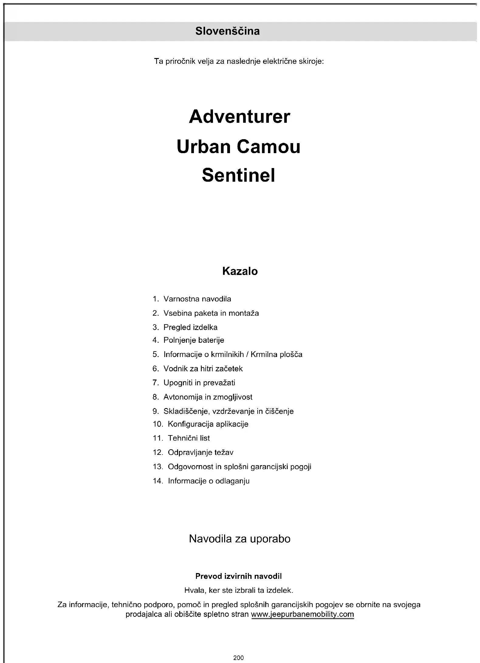 Zaradi stalnega tehnološkega napredka si proizvajalec pridržuje pravico do spremembe izdelka brez predhodnega obvestila, ne da bi se ta priročnik samodejno posodabljal. Za informacije in pregled revizij tega priročnika obiščite spletno stran www.jeepurbanemobility.com Adventurer / Urban Camou Pospeševalnik Kolutne zavore Kavelj za zapiranje Puščično stikalo Zavorna ročica Zaslon Kavelj za zapiranje Podnožna deska Stojalo Zadnje vzmetene vilice Nosilno ogrodje Varnostni mehanizem Mehanizem zapiranja Motor z elektronsko zavoro Sprednje vzmetene vilice208 Sentinel Kavelj za zapiranje Zadnji blatnik Puščično stikalo Zavorna ročica Podnožna deska Stojalo Kolutne zavore Luč zadaj Vrata za polnjenje Varnostni mehanizem Mehanizem zapiranja Motor z elektronsko zavoro Pospeševalnik Sprednja luč Kavelj za zapiranje Zaslon Vzmetene vilice209 POZOR Ob prvi uporabi izdelek napolnite do 100 %. Poskrbite, da so proizvod, polnilnik in polnilna vratca suhi. Navodila
