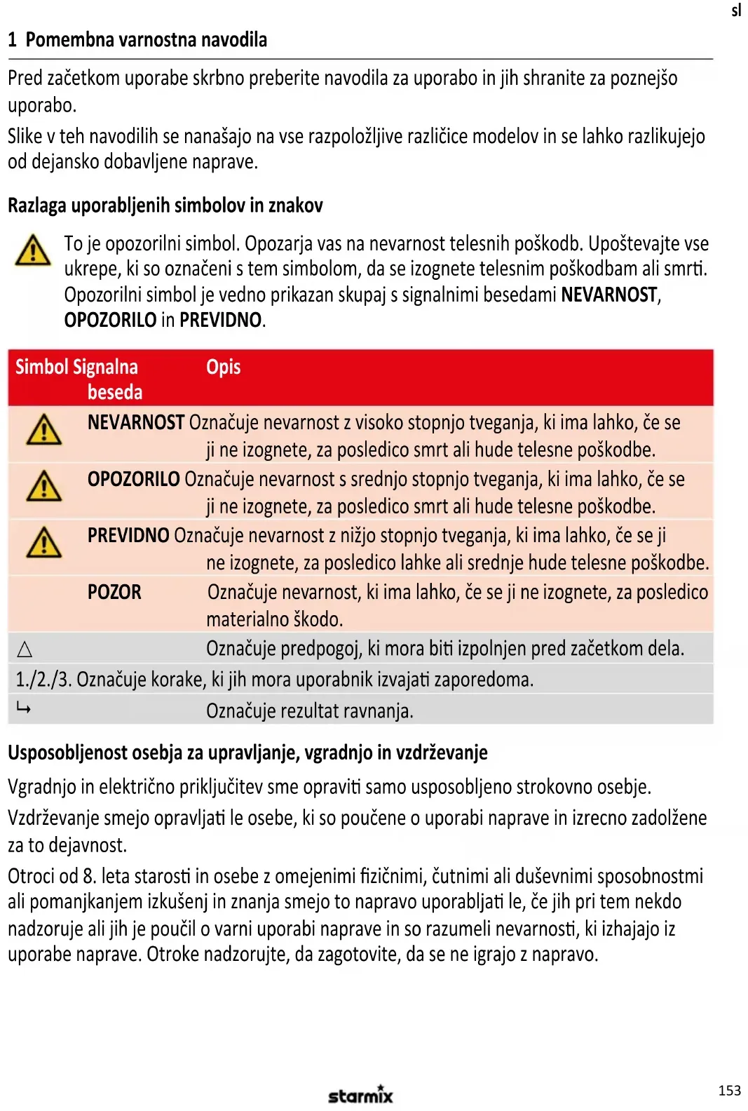 1 Pomembna varnostna navodila Pred začetkom uporabe skrbno preberite navodila za uporabo in jih shranite za poznejšo uporabo. Slike v teh navodilih se nanašajo na vse razpoložljive različice modelov in se lahko razlikujejo od dejansko dobavljene naprave. Razlaga uporabljenih simbolov in znakov To je opozorilni simbol. Opozarja vas na nevarnost telesnih poškodb. Upoštevajte vse ukrepe, ki so označeni s tem simbolom, da se izognete telesnim poškodbam ali smr. Opozorilni simbol je vedno prikazan skupaj s signalnimi besedami NEVARNOST, OPOZORILO in PREVIDNO. Simbol Signalna beseda Opis NEVARNOST Označuje nevarnost z visoko stopnjo tveganja, ki ima lahko, če se ji ne izognete, za posledico smrt ali hude telesne poškodbe. OPOZORILO Označuje nevarnost s srednjo stopnjo tveganja, ki ima lahko, če se ji ne izognete, za posledico smrt ali hude telesne poškodbe. PREVIDNO Označuje nevarnost z nižjo stopnjo tveganja, ki ima lahko, če se ji ne izognete, za posledico lahke ali srednje hude telesne poškodbe. POZOR Označuje nevarnost, ki ima lahko, če se ji ne izognete, za posledico materialno škodo.
