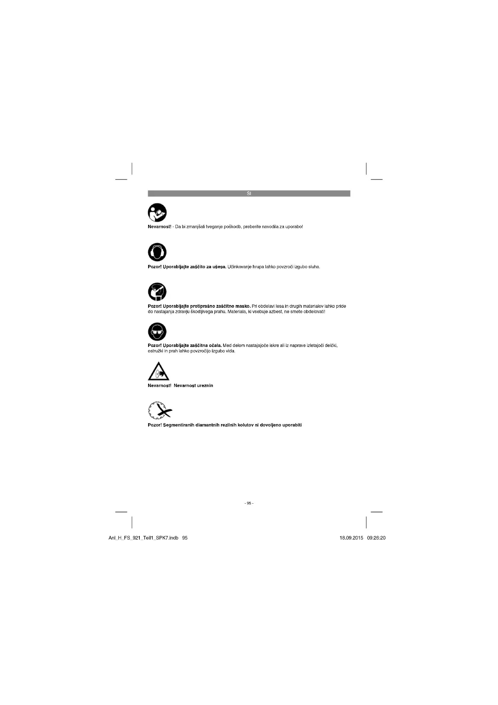 Nevarnost! Nevarnost ureznin Pozor! Segmentiranih diamantnih rezilnih kolutov ni dovoljeno uporabiti Nevarnost! - Da bi zmanjšali tveganje poškodb, preberite navodila za uporabo! Pozor! Uporabljajte zaščito za ušesa. Učinkovanje hrupa lahko povzroči izgubo sluha. Pozor! Uporabljajte zaščitna očala. Med delom nastajajoče iskre ali iz naprave izletajoči delčki, ostružki in prah lahko povzročijo izgubo vida. Pozor! Uporabljajte protiprašno zaščitno masko. Pri obdelavi lesa in drugih materialov lahko pride do nastajanja zdravju škodljivega prahu. Materiala, ki vsebuje azbest, ne smete obdelovati! Anl_H_FS_921_Teil1_SPK7.indb 95Anl_H_FS_921_Teil1_SPK7.indb 95 18.09.2015 09:26:2018.09.2015 09:26:20SI