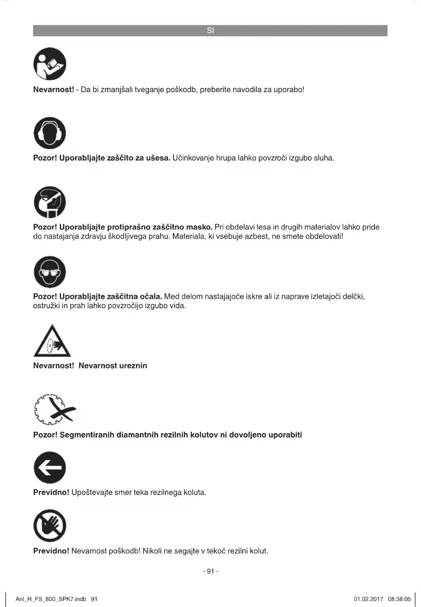 Nevarnost! Nevarnost ureznin Pozor! Segmentiranih diamantnih rezilnih kolutov ni dovoljeno uporabiti Nevarnost! - Da bi zmanjšali tveganje poškodb, preberite navodila za uporabo! Pozor! Uporabljajte zaščito za ušesa. Učinkovanje hrupa lahko povzroči izgubo sluha. Pozor! Uporabljajte zaščitna očala. Med delom nastajajoče iskre ali iz naprave izletajoči delčki, ostružki in prah lahko povzročijo izgubo vida. Pozor! Uporabljajte protiprašno zaščitno masko. Pri obdelavi lesa in drugih materialov lahko pride do nastajanja zdravju škodljivega prahu. Materiala, ki vsebuje azbest, ne smete obdelovati! Previdno! Nevarnost poškodb! Nikoli ne segajte v tekoč rezilni kolut. Previdno! Upoštevajte smer teka rezilnega koluta. Anl_H_FS_800_SPK7.indb 91Anl_H_FS_800_SPK7.indb 91 01.02.2017 08:38:0501.02.2017 08:38:05SI
