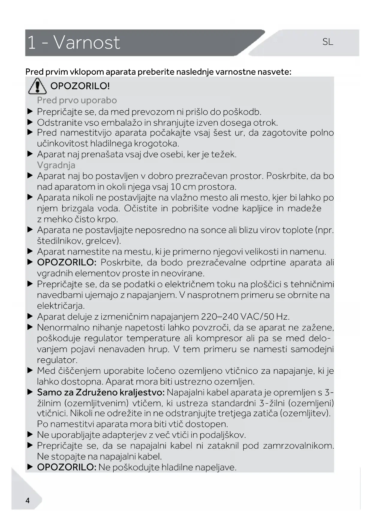 OPOZORILO! Pred prvo uporabo Prepričajte se, da med prevozom ni prišlo do poškodb. Odstranite vso embalažo in shranjujte izven dosega otrok. Pred namestitvijo aparata počakajte vsaj šest ur, da zagotovite polno učinkovitost hladilnega krogotoka. Aparat naj prenašata vsaj dve osebi, ker je težek. Vgradnja Aparat naj bo postavljen v dobro prezračevan prostor. Poskrbite, da bo nad aparatom in okoli njega vsaj 10 cm prostora. Aparata nikoli ne postavljajte na vlažno mesto ali mesto, kjer bi lahko po njem brizgala voda. Očistite in pobrišite vodne kapljice in madeže z mehko čisto krpo. Aparata ne postavljajte neposredno na sonce ali blizu virov toplote (npr. štedilnikov, grelcev). Aparat namestite na mestu, ki je primerno njegovi velikosti in namenu. OPOZORILO: Poskrbite, da bodo prezračevalne odprtine aparata ali vgradnih elementov proste in neovirane. Prepričajte se, da se podatki o električnem toku na ploščici s tehničnimi navedbami ujemajo z napajanjem. V nasprotnem primeru se obrnite na električarja. Aparat deluje z izmeničnim napajanjem 220–240 VAC/50 Hz. Nenormalno nihanje napetosti lahko povzroči, da se aparat ne zažene, poškoduje regulator temperature ali kompresor ali pa se med delo- vanjem pojavi nenavaden hrup. V tem primeru se namesti samodejni regulator. Med čiščenjem uporabite ločeno ozemljeno vtičnico za napajanje, ki je lahko dostopna. Aparat mora biti ustrezno ozemljen. Samo za Združeno kraljestvo: Napajalni kabel aparata je opremljen s 3- žilnim (ozemljitvenim) vtičem, ki ustreza standardni 3-žilni (ozemljeni) vtičnici. Nikoli ne odrežite in ne odstranjujte tretjega zatiča (ozemljitev). Po namestitvi aparata mora biti vtič dostopen. Ne uporabljajte adapterjev z več vtiči in podaljškov. Prepričajte se, da se napajalni kabel ni zataknil pod zamrzovalnikom. Ne stopajte na napajalni kabel. OPOZORILO: Ne poškodujte hladilne napeljave.SL