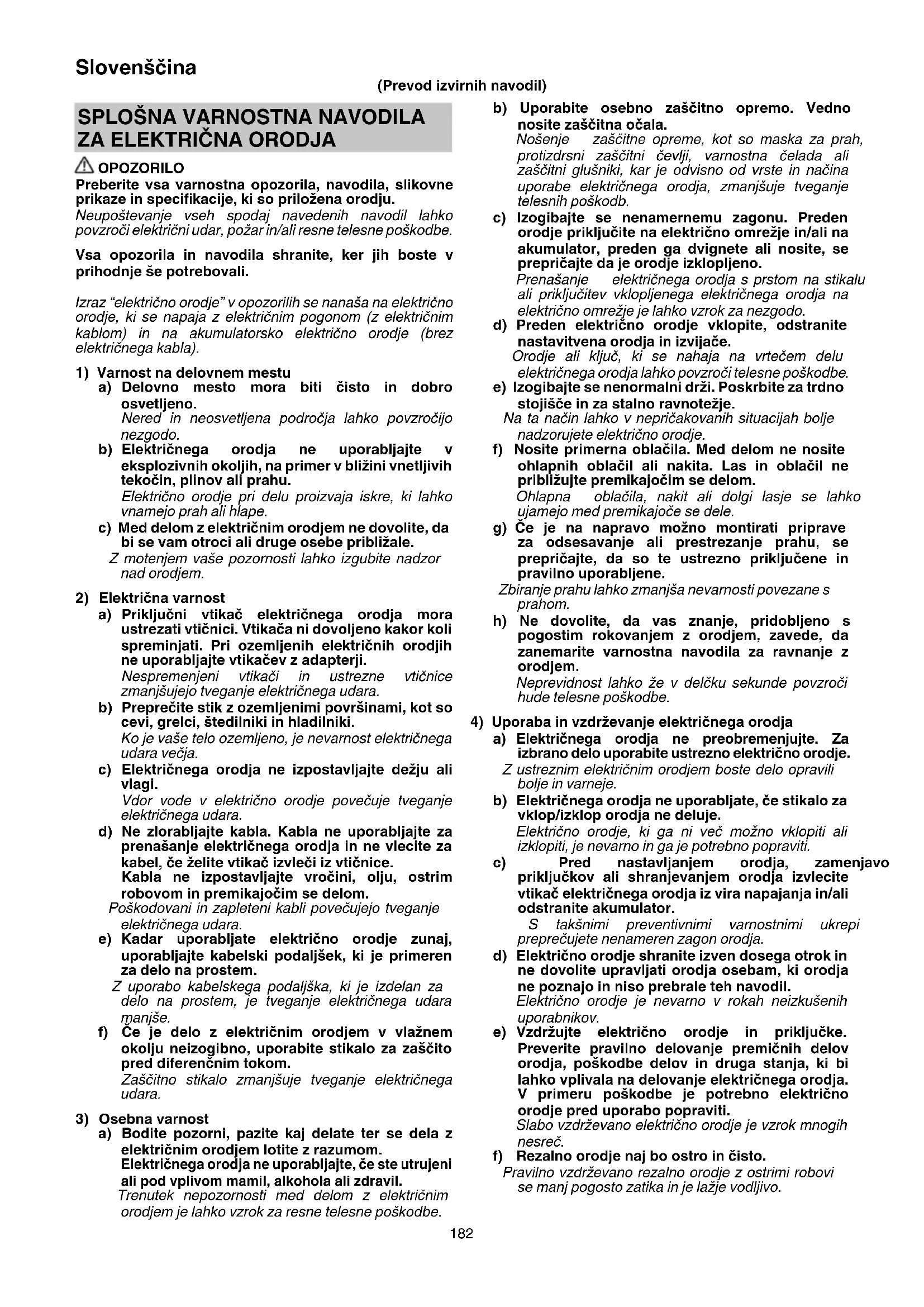OPOZORILO Preberite vsa varnostna opozorila, navodila, slikovne prikaze in specifi kacije, ki so priložena orodju. Neupoštevanje vseh spodaj navedenih navodil lahko povzroči električni udar, požar in/ali resne telesne poškodbe. Vsa opozorila in navodila shranite, ker jih boste v prihodnje še potrebovali. Izraz “električno orodje” v opozorilih se nanaša na električno orodje, ki se napaja z električnim pogonom (z električnim kablom) in na akumulatorsko električno orodje (brez električnega kabla).