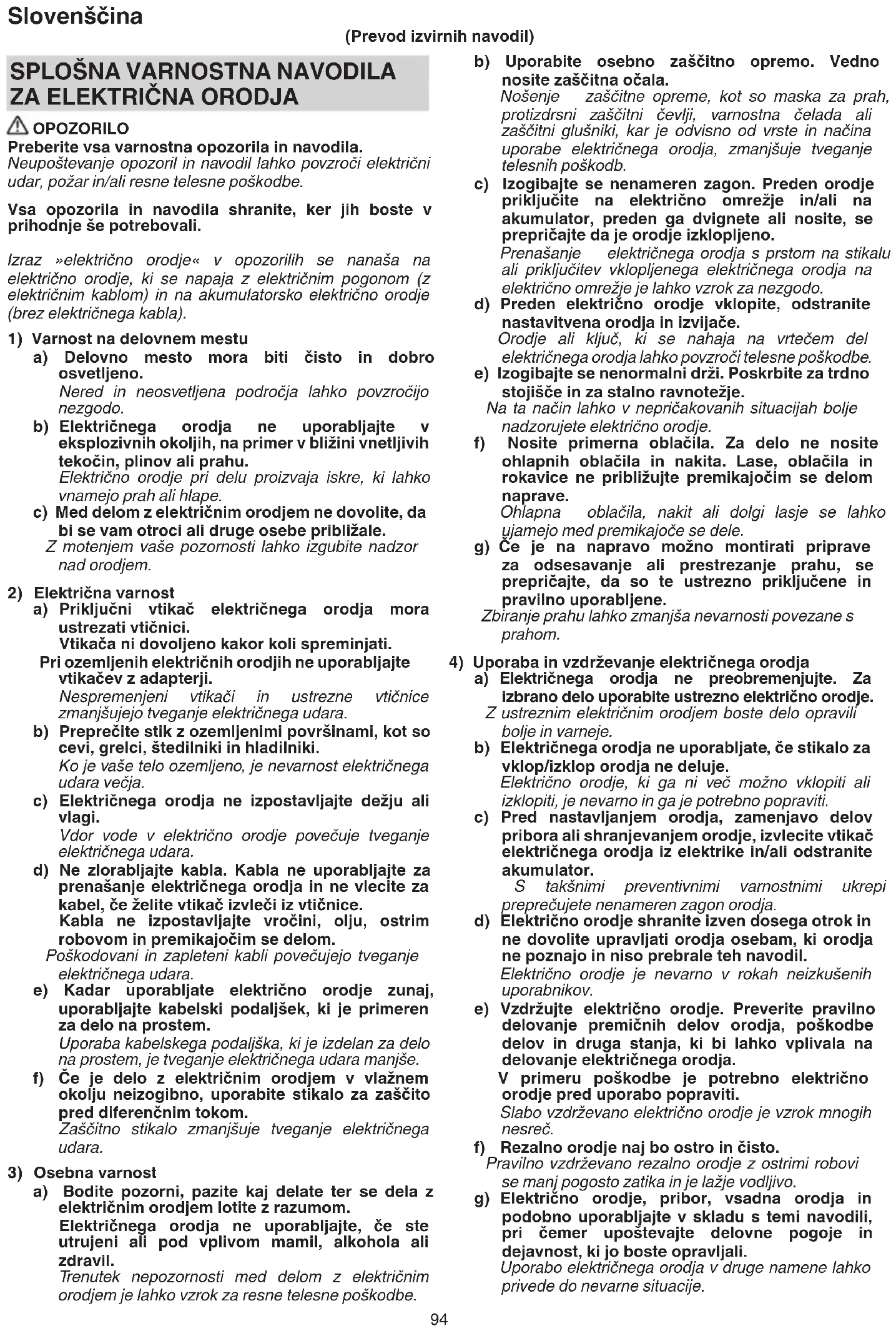 OPOZORILO Preberite vsa varnostna opozorila in navodila. Neupoštevanje opozoril in navodil lahko povzroči električni udar, požar in/ali resne telesne poškodbe. Vsa opozorila in navodila shranite, ker jih boste v prihodnje še potrebovali. Izraz »električno orodje« v opozorilih se nanaša na električno orodje, ki se napaja z električnim pogonom (z električnim kablom) in na akumulatorsko električno orodje (brez električnega kabla).