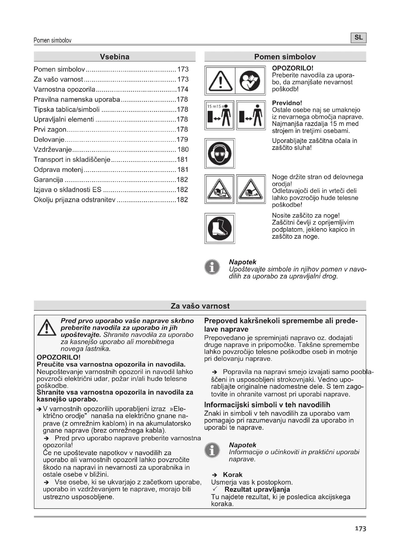 - Okolju prijazna odstranitev Pomen simbolov OPOZORILO! Preberite navodila za upora- bo, da zmanjšate nevarnost poškodb! 15 m15 m Previdno! Ostale osebe naj se umaknejo iz nevarnega območja naprave. Najmanjša razdalja 15 m med strojem in tretjimi osebami. Uporabljajte zaščitna očala in zaščito sluha! Noge držite stran od delovnega orodja! Odletavajoči deli in vrteči deli lahko povzročijo hude telesne poškodbe! Nosite zaščito za noge! Zaščitni čevlji z oprijemljivim podplatom, jekleno kapico in zaščito za noge. Napotek Upoštevajte simbole in njihov pomen v navo- dilih za uporabo za upravljalni drog. Za vašo varnost Pred prvo uporabo vaše naprave skrbno preberite navodila za uporabo in jih upoštevajte. Shranite navodila za uporabo za kasnejšo uporabo ali morebitnega novega lastnika. OPOZORILO! Preučite vsa varnostna opozorila in navodila. Neupoštevanje varnostnih opozoril in navodil lahko povzroči električni udar, požar in/ali hude telesne poškodbe. Shranite vsa varnostna opozorila in navodila za kasnejšo uporabo. Î V varnostnih opozorilih uporabljeni izraz »Ele- ktrično orodje" nanaša na električno gnane na- prave (z omrežnim kablom) in na akumulatorsko gnane naprave (brez omrežnega kabla). Î Pred prvo uporabo naprave preberite varnostna opozorila! Če ne upoštevate napotkov v navodilih za uporabo ali varnostnih opozoril lahko povzročite škodo na napravi in nevarnosti za uporabnika in ostale osebe v bližini. Î Vse osebe, ki se ukvarjajo z začetkom uporabe, uporabo in vzdrževanjem te naprave, morajo biti ustrezno usposobljene. Prepoved kakršnekoli spremembe ali prede- lave naprave Prepovedano je spreminjati napravo oz. dodajati druge naprave in pripomočke. Takšne spremembe lahko povzročijo telesne poškodbe oseb in motnje pri delovanju naprave. Î Popravila na napravi smejo izvajati samo poobla- ščeni in usposobljeni strokovnjaki. Vedno upo- rabljajte originalne nadomestne dele. S tem zago- tovite in ohranite varnost pri uporabi naprave. Informacijski simboli v teh navodilih Znaki in simboli v teh navodilih za uporabo vam pomagajo pri razumevanju navodil za uporabo in uporabi te naprave. Napotek Informacije o učinkoviti in praktični uporabi naprave. Î Korak Usmerja vas k postopkom. 3 Rezultat upravljanja Tu najdete rezultat, ki je posledica akcijskega koraka. VsebinaZa vašo varnost p. 182