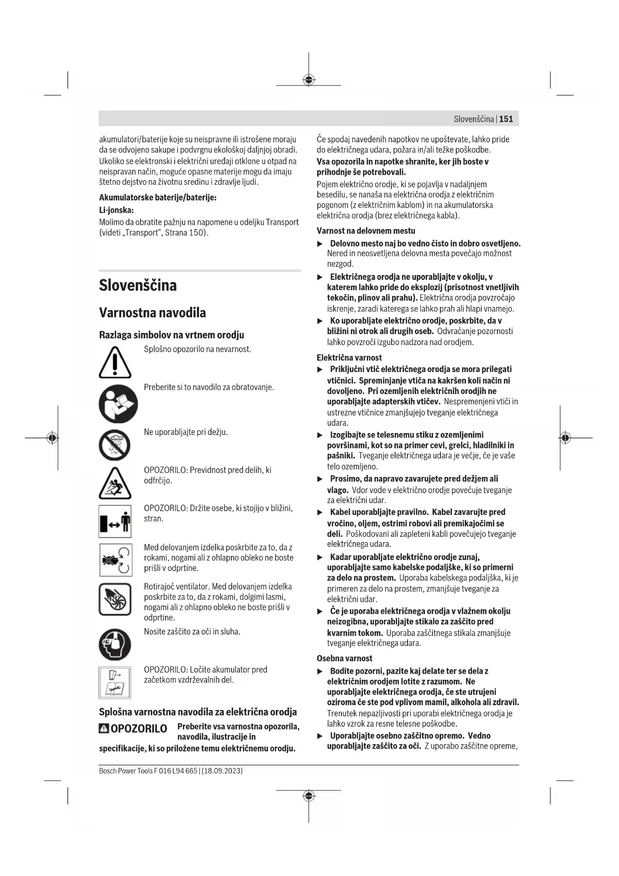 Simboli Sledeći simboli su važni za čitanje i razumevanje uputstva za upotrebu. Zapamtite simbole i njihovo značenje. Pravilno tumačenje simbola pomaže vam da bolje i sigurnije koristite proizvod. Simbol Značenje Pravac kretanja Uključivanje Uključivanje Isključivanje CLICK! Čujni zvuk Pribor Rešavanje problema Sledeća tabela pokazuje simptome grešaka i kako da si pomognete ako vaš uređaj ne radi ispravno. Ako time ne možete lokalizovati problem i odstraniti ga, obratite se ovlašćenom servisu. Pažnja: Pre traženja grešaka isključite proizvod. Pažnja: U slučaju nezgode ili loma alata odmah zaustavite mašinu i izvadite akumulator. Bosch Power Tools F 016 L94 665 | (18.09.2023)150 | Srpski Simptom Mogući uzrok Rešenje Baštenski uređaj ne radi Akumulator je ispražnjen Napunite akumulator Akumulator nije ispravno stavljen Ispravno stavite akumulator (vidi sliku C) Akumulator je prehladan/pretopao Pustite akumulator da se zagreje/ohladi. Pokrenite proizvod uvek sa malim brojem obrtaja Baštenski uređaj je neispravan Kontaktirajte korisničku službu Baštenski uređaj radi sa prekidima Prekidač za uključivanje/isključivanje je u kvaru Kontaktirajte korisničku službu Regulator brzine vazdušne struje je neispravan Kontaktirajte korisničku službu Jake vibracije/buka Baštenski uređaj je neispravan Kontaktirajte korisničku službu Trajanje rada po punjenju akumulatora je prekratko Akumulator nije korišćen duže vreme ili je samo na kratko korišćen Potpuno napunite akumulator Akumulator je prazan ili u kvaru Zamenite akumulator Baštenski uređaj ne duva Mlaznica je blokirana Oslobodite mlaznicu Smanjen protok vazduha Dovod vazduha je blokiran Oslobodite dovod vazduha Akumulator je prehladan Pokrenite proizvod uvek sa malim brojem obrtaja Mlaznicu nije moguće montirati Pogrešna montaža Ispravno montirajte mlaznicu (vidi sliku B) Održavanje i servisiranje Održavanje, čišćenje i skladištenje u Proizvode sme da popravlja samo kvalifikovano osoblje i samo sa originalnim rezervnim delovima. Time se obezbeđuje, da sigurnost ostane sačuvana. u Nikada ne servisirajte oštećene akumulatorske baterije. Servisiranje akumulatorskih baterija treba da vrše isključivo proizvođač ili ovlašćeni serviseri. Održavanje, čišćenje i skladištenje Očistite proizvod krpom pre skladištenja. Kod čišćenja i sastavljanja mlaznice proverite da li se motor isključio i da li je akumulator iskopčan. Nikad ne koristite rastvarače. Nikada ne prskajte proizvod vodom. Nikada ne uranjajte proizvod u vodu. Servis i saveti za upotrebu Servis odgovara na vaša pitanja u vezi sa popravkom i održavanjem vašeg proizvoda kao i u vezi sa rezervnim delovima. Šematske prikaze i informacije u vezi rezervnih delova naći ćete i pod: www.bosch-pt.com Bosch tim za konsultacije vam rado pomaže tokom primene, ukoliko imate pitanja o našim proizvodima i njihovom priboru. Molimo da kod svih pitanja i naručivanja rezervnih delova neizostavno navedete broj artikla sa 10brojčanih mesta prema tipskoj pločici proizvoda. Srpski Bosch Elektroservis Dimitrija Tucovića 59 11000 Beograd Tel.: +381 11 644 8546 Tel.: +381 11 744 3122 Tel.: +381 11 641 6291 Fax: +381 11 641 6293 E-Mail: office@servis-bosch.rs www.bosch-pt.rs Dodatne adrese servisa pogledajte na: www.bosch-pt.com/serviceaddresses Transport Preporučeni litijum-jonski akumulatori podležu zahtevima propisa o opasnim materijama. Korisnik može bez dodatnih uslova transportovati akumulatore na drumu. Kod slanja preko trećih lica (na primer vazdušnih transportom ili špedicijom) mora se obratiti pažnja na posebne zahteve u pogledu pakovanja i označavanja. Tada se kod pripreme paketa za slanje mora pozvati stručnjak za opasne materije. Akumulatorske baterije šaljite samo ako kućište nije oštećeno. Odlepite otvorene kontakte i upakujte akumulatorsku bateriju tako, da se ne pokreće u paketu. Molimo da obratite pažnju na eventualne dalje nationalne propise. Uklanjanje đubreta Proizvode, akumulatore, pribor i pakovanja treba odvesti na ekološki savesno recikliranje. Proizvode i akumulatore/baterije ne bacajte u kućni otpad! Samo za EU‑zemlje: Prema Evropskoj direktivi 2012/19/EU proizvodi koji nisu više upotrebljivi, a prema Evropskoj direktivi 2006/66/EZ F 016 L94 665 | (18.09.2023) Bosch Power ToolsSlovenščina | 151 akumulatori/baterije koje su neispravne ili istrošene moraju da se odvojeno sakupe i podvrgnu ekološkoj daljnjoj obradi. Ukoliko se elektronski i električni uređaji otklone u otpad na neispravan način, moguće opasne materije mogu da imaju štetno dejstvo na životnu sredinu i zdravlje ljudi. Akumulatorske baterije/baterije: Li-jonska: Molimo da obratite pažnju na napomene u odeljku Transport (videti „Transport“, Strana150). Slovenščina Varnostna navodila Razlaga simbolov na vrtnem orodju Splošno opozorilo na nevarnost. Preberite si to navodilo za obratovanje. Ne uporabljajte pri dežju. OPOZORILO: Previdnost pred delih, ki odfrčijo. OPOZORILO: Držite osebe, ki stojijo v bližini, stran. Med delovanjem izdelka poskrbite za to, da z rokami, nogami ali z ohlapno obleko ne boste prišli v odprtine. Rotirajoč ventilator. Med delovanjem izdelka poskrbite za to, da z rokami, dolgimi lasmi, nogami ali z ohlapno obleko ne boste prišli v odprtine. Nosite zaščito za oči in sluha. OPOZORILO: Ločite akumulator pred začetkom vzdrževalnih del. Splošna varnostna navodila za električna orodja OPOZORILO Preberite vsa varnostna opozorila, navodila, ilustracije in specifikacije, ki so priložene temu električnemu orodju. Če spodaj navedenih napotkov ne upoštevate, lahko pride do električnega udara, požara in/ali težke poškodbe. Vsa opozorila in napotke shranite, ker jih boste v prihodnje še potrebovali. Pojem električno orodje, ki se pojavlja v nadaljnjem besedilu, se nanaša na električna orodja z električnim pogonom (z električnim kablom) in na akumulatorska električna 
