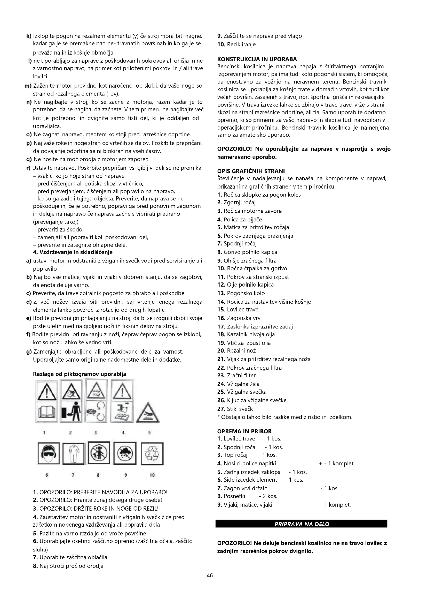 OPOZORILO! Ne deluje bencinski kosilnico ne na travo lovilec z zadnjim razrešnice pokrov dvignilo.47 OPOZORILO! Vse vzdrževanje, popravila, prilagoditve in delo za pripravo aktivnosti morajo biti izvedene z motorja off.