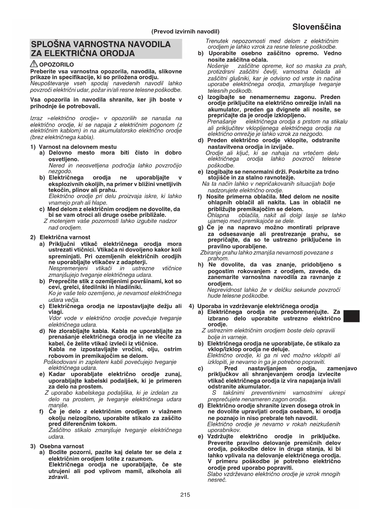 OPOZORILO Preberite vsa varnostna opozorila, navodila, slikovne prikaze in specifi kacije, ki so priložena orodju. Neupoštevanje vseh spodaj navedenih navodil lahko povzroči električni udar, požar in/ali resne telesne poškodbe. Vsa opozorila in navodila shranite, ker jih boste v prihodnje še potrebovali. Izraz »električno orodje« v opozorilih se nanaša na električno orodje, ki se napaja z električnim pogonom (z električnim kablom) in na akumulatorsko električno orodje (brez električnega kabla).