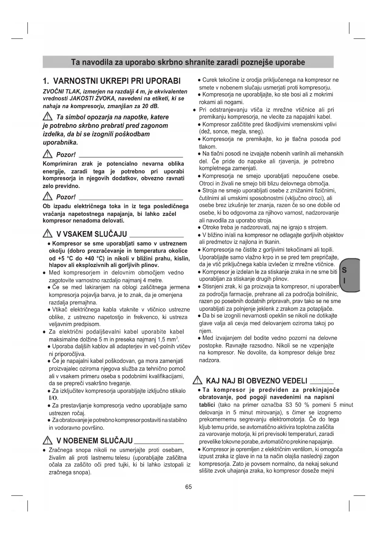 ZVOČNI TLAK, izmerjen na razdalji 4 m, je ekvivalenten vrednosti JAKOSTI ZVOKA, navedeni na etiketi, ki se nahaja na kompresorju, zmanjšan za 20 dB. Ta simbol opozarja na napotke, katere je potrebno skrbno prebrati pred zagonom izdelka, da bi se izognili poškodbam uporabnika. Pozor! Komprimiran zrak je potencialno nevarna oblika energije, zaradi tega je potrebno pri uporabi kompresorja in njegovih dodatkov, obvezno ravnati zelo previdno. Pozor! Ob izpadu električnega toka in iz tega posledičnega vračanja napetostnega napajanja, bi lahko začel kompresor nenadoma delovati.