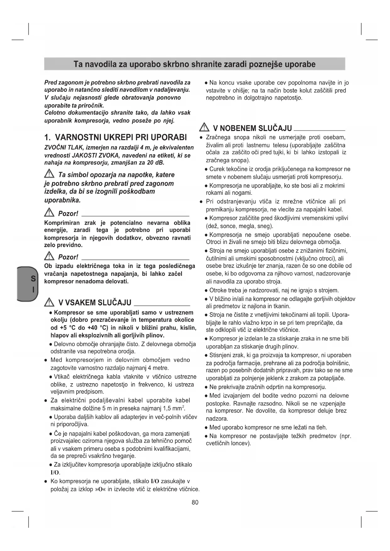 ● Zračnega snopa nikoli ne usmerjajte proti osebam, živalim ali proti lastnemu telesu (uporabljajte zaščitna očala za zaščito oči pred tujki, ki bi lahko izstopali iz zračnega snopa). ● Curek tekočine iz orodja priključenega na kompresor ne smete v nobenem slučaju usmerjati proti kompresorju. ● Kompresorja ne uporabljajte, ko ste bosi ali z mokrimi rokami ali nogami. ● Pri odstranjevanju vtiča iz mrežne vtičnice ali pri premikanju kompresorja, ne vlecite za napajalni kabel. ● Kompresor zaščitite pred škodljivimi vremenskimi vplivi (dež, sonce, megla, sneg). ● Kompresorja ne smejo uporabljati nepoučene osebe. Otroci in živali ne smejo biti blizu delovnega območja. ● Stroja ne smejo uporabljati osebe z znižanimi zičnimi, čutilnimi ali umskimi sposobnostmi (vključno otroci), ali osebe brez izkušnje ter znanja, razen če so one dobile od osebe, ki bo odgovorna za njihovo varnost, nadzorovanje ali navodila za uporabo stroja. ● Otroke treba je nadzorovati, naj ne igrajo s strojem. ● V bližino in/ali na kompresor ne odlagajte gorljivih objektov ali predmetov iz najlona in tkanin. ● Stroja ne čistite z vnetljivimi tekočinami ali topili. Upora- bljajte le rahlo vlažno krpo in se pri tem prepričajte, da ste odklopili vtič iz električne vtičnice. ● Kompresor je izdelan le za stiskanje zraka in ne sme biti uporabljan za stiskanje drugih plinov. ● Stisnjeni zrak, ki ga proizvaja ta kompresor, ni uporaben za področja farmacije, prehrane ali za področja bolnišnic, razen po posebnih dodatnih pripravah, prav tako se ne sme uporabljati za polnjenje jeklenk z zrakom za potapljače. ● Ne prekrivajte zračnih odprtin na kompresorju. ● Med izvajanjem del bodite vedno pozorni na delovne postopke. Ravnajte razsodno. Nikoli se ne vzpenjajte na kompresor. Ne dovolite, da kompresor deluje brez nadzora. ● Med uporabo kompresor ne sme ležati na tleh. ● Na kompresor ne postavljajte težkih predmetov (npr. cvetličnih loncev).81