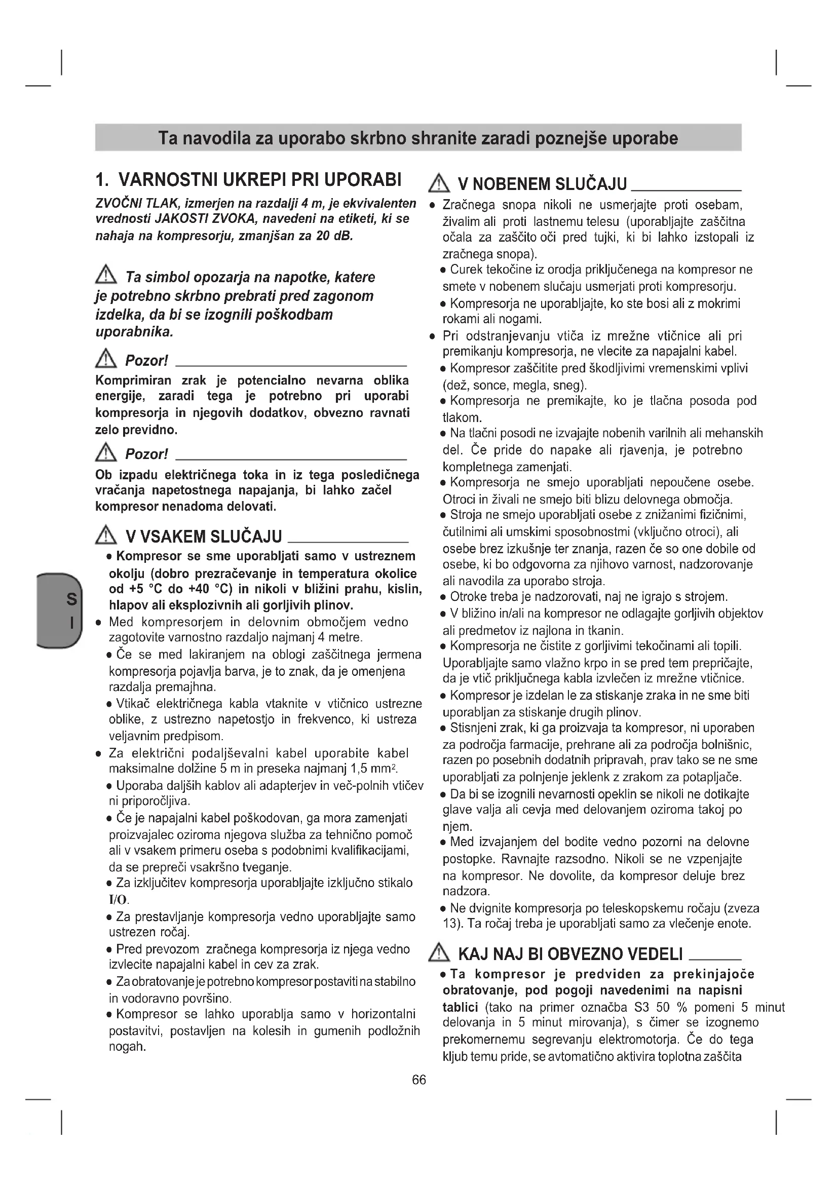 ZVOČNI TLAK, izmerjen na razdalji 4 m, je ekvivalenten vrednosti JAKOSTI ZVOKA, navedeni na etiketi, ki se nahaja na kompresorju, zmanjšan za 20 dB. Ta simbol opozarja na napotke, katere je potrebno skrbno prebrati pred zagonom izdelka, da bi se izognili poškodbam uporabnika. Pozor! Komprimiran zrak je potencialno nevarna oblika energije, zaradi tega je potrebno pri uporabi kompresorja in njegovih dodatkov, obvezno ravnati zelo previdno. Pozor! Ob izpadu električnega toka in iz tega posledičnega vračanja napetostnega napajanja, bi lahko začel kompresor nenadoma delovati.