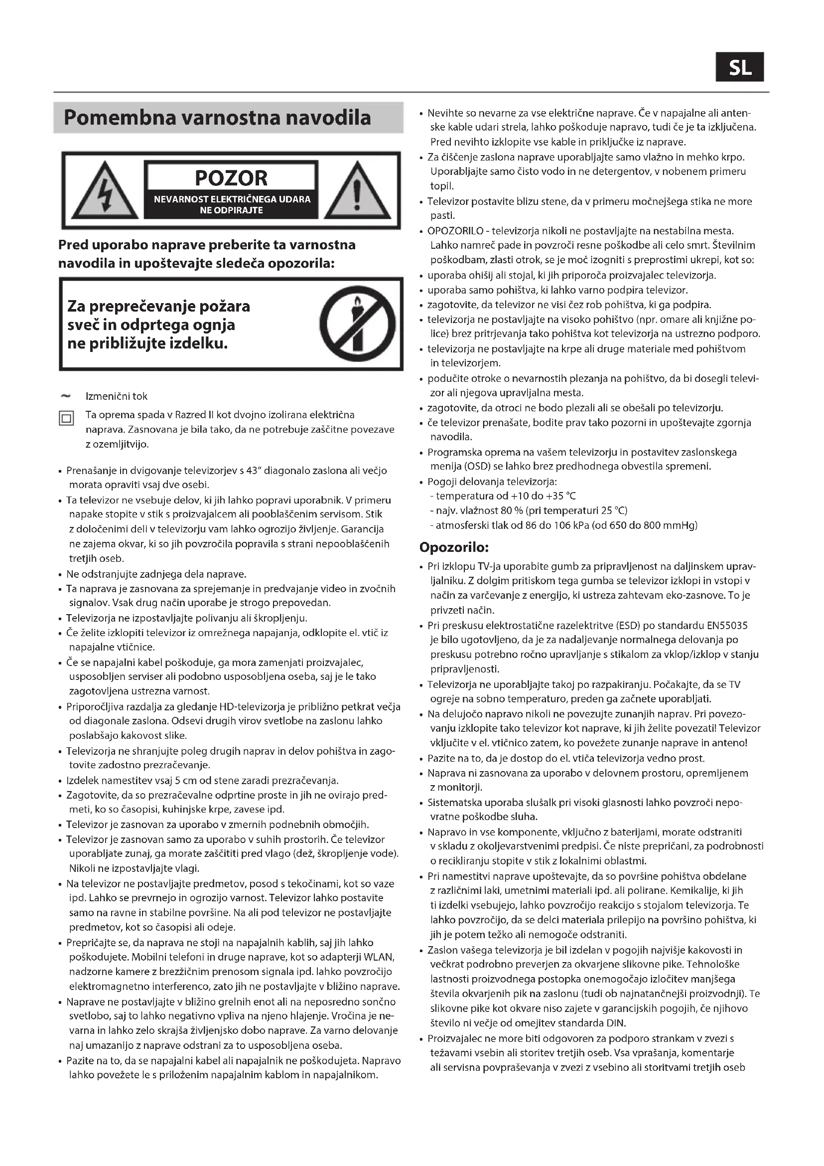 - Televizorja ne uporabljajte takoj po razpakiranju. Počakajte, da se TV ogreje na sobno temperaturo, preden ga začnete uporabljati.