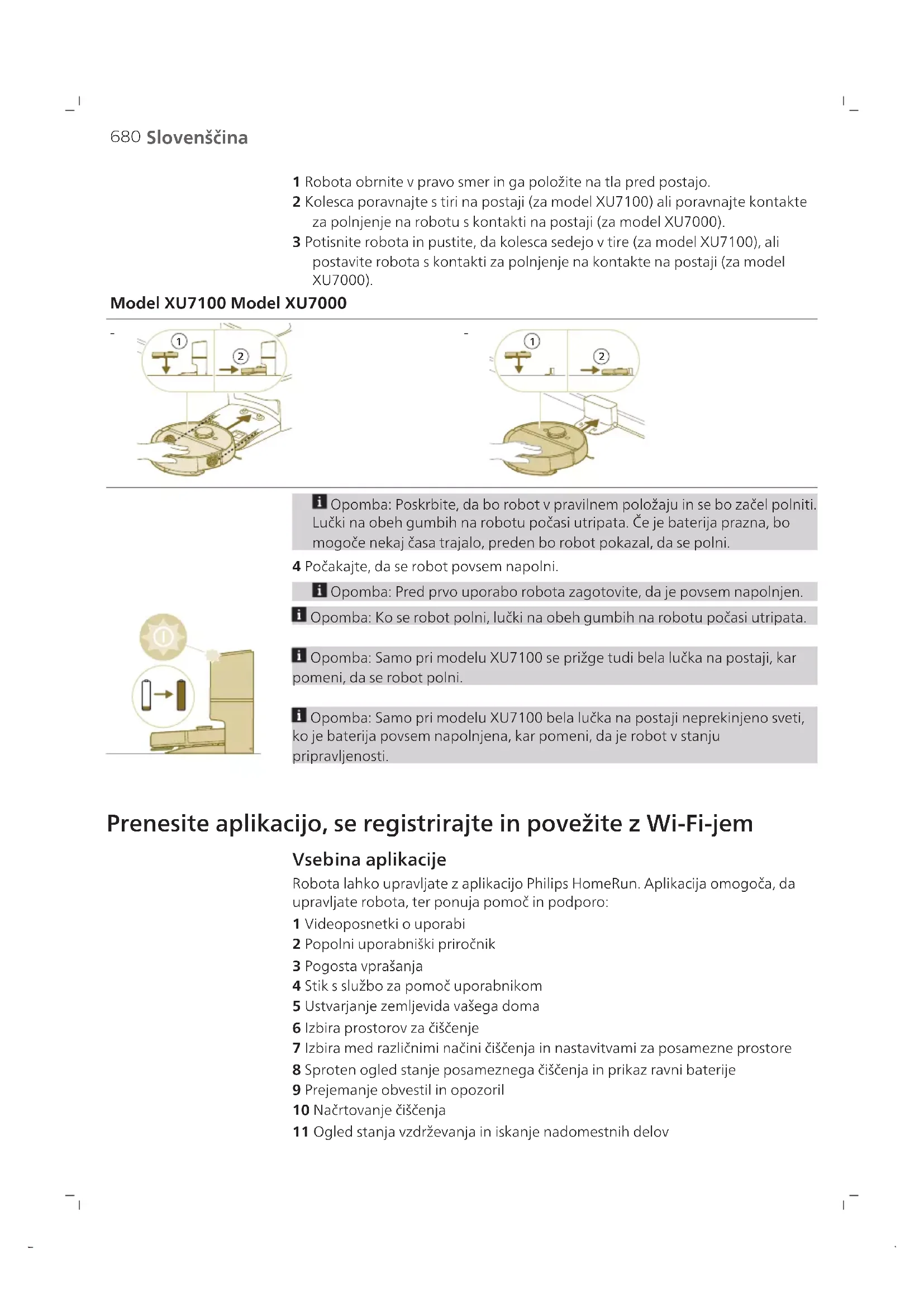 Opomba: Poskrbite, da bo robot v pravilnem položaju in se bo začel polniti. Lučki na obeh gumbih na robotu počasi utripata. Če je baterija prazna, bo mogoče nekaj časa trajalo, preden bo robot pokazal, da se polni. 4 Počakajte, da se robot povsem napolni. Opomba: Pred prvo uporabo robota zagotovite, da je povsem napolnjen. Opomba: Ko se robot polni, lučki na obeh gumbih na robotu počasi utripata. Opomba: Samo pri modelu XU7100 se prižge tudi bela lučka na postaji, kar pomeni, da se robot polni. Opomba: Samo pri modelu XU7100 bela lučka na postaji neprekinjeno sveti, ko je baterija povsem napolnjena, kar pomeni, da je robot v stanju pripravljenosti. Prenesite aplikacijo, se registrirajte in povežite z Wi-Fi-jem Vsebina aplikacije Robota lahko upravljate z aplikacijo Philips HomeRun. Aplikacija omogoča, da upravljate robota, ter ponuja pomoč in podporo: 1 Videoposnetki o uporabi 2 Popolni uporabniški priročnik 3 Pogosta vprašanja 4 Stik s službo za pomoč uporabnikom 5 Ustvarjanje zemljevida vašega doma 6 Izbira prostorov za čiščenje 7 Izbira med različnimi načini čiščenja in nastavitvami za posamezne prostore 8 Sproten ogled stanje posameznega čiščenja in prikaz ravni baterije 9 Prejemanje obvestil in opozoril 10 Načrtovanje čiščenja 11 Ogled stanja vzdrževanja in iskanje nadomestnih delov681 Slovenščina 12 Povezava robota z glasovnim pomočnikom in upravljanje z glasovnimi ukazi Prenos aplikacije 1 Optično preberite kodo QR na platnici uporabniškega priročnika ali na embalaži robota. Ali: V trgovini z aplikacijami App Store ali v kateri od Androidovih trgovin z aplikacijami poiščite aplikacijo za robota »Philips HomeRun«. 2 Prenesite in namestite aplikacijo. 3 Sledite navodilom v aplikaciji. Registracija osebnega računa Registrirate lahko osebni račun in izkoristite naslednje prednosti: