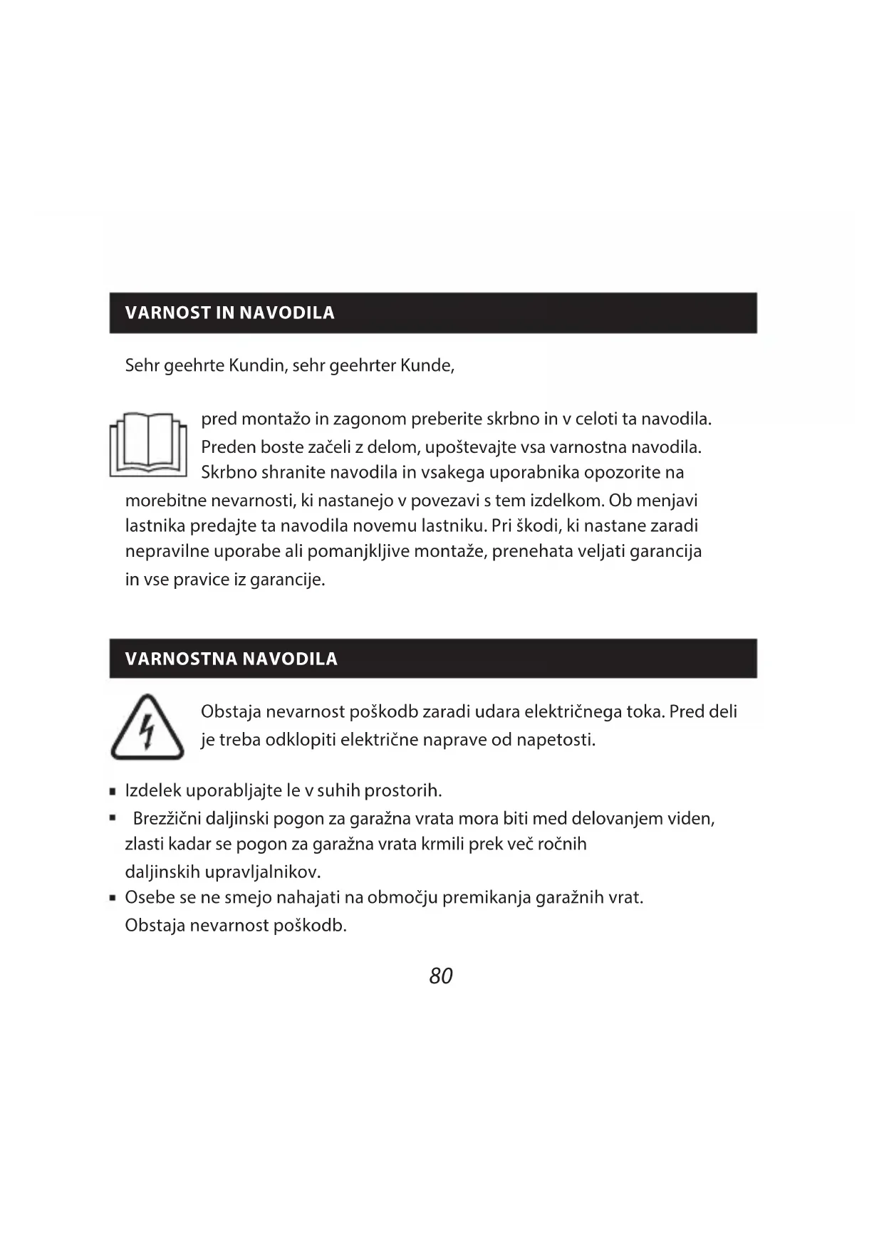Sehr geehrte Kundin, sehr geehrter Kunde, pred montažo in zagonom preberite skrbno in v celoti ta navodila Preden boste začeli z delom, upoštevajte vsa varnostna navodila Skrbno shranite navodila in vsakega uporabnika opozorite na morebitne nevarnosti, ki nastanejo v povezavi s tem izdelkom Ob menjavi lastnika predajte ta navodila novemu lastniku Pri škodi, ki nastane zaradi nepravilne uporabe ali pomanjkljive montaže, prenehata veljati garancija in vse pravice iz garancije VARNOSTNA NAVODILA Obstaja nevarnost poškodb zaradi udara električnega toka Pred deli je treba odklopiti električne naprave od napetosti Izdelek uporabljajte le v suhih prostorih Brezžični daljinski pogon za garažna vrata mora biti med delovanjem viden, zlasti kadar se pogon za garažna vrata krmili prek več ročnih daljinskih upravljalnikov Osebe se ne smejo nahajati na območju premikanja garažnih vrat Obstaja nevarnost poškodb