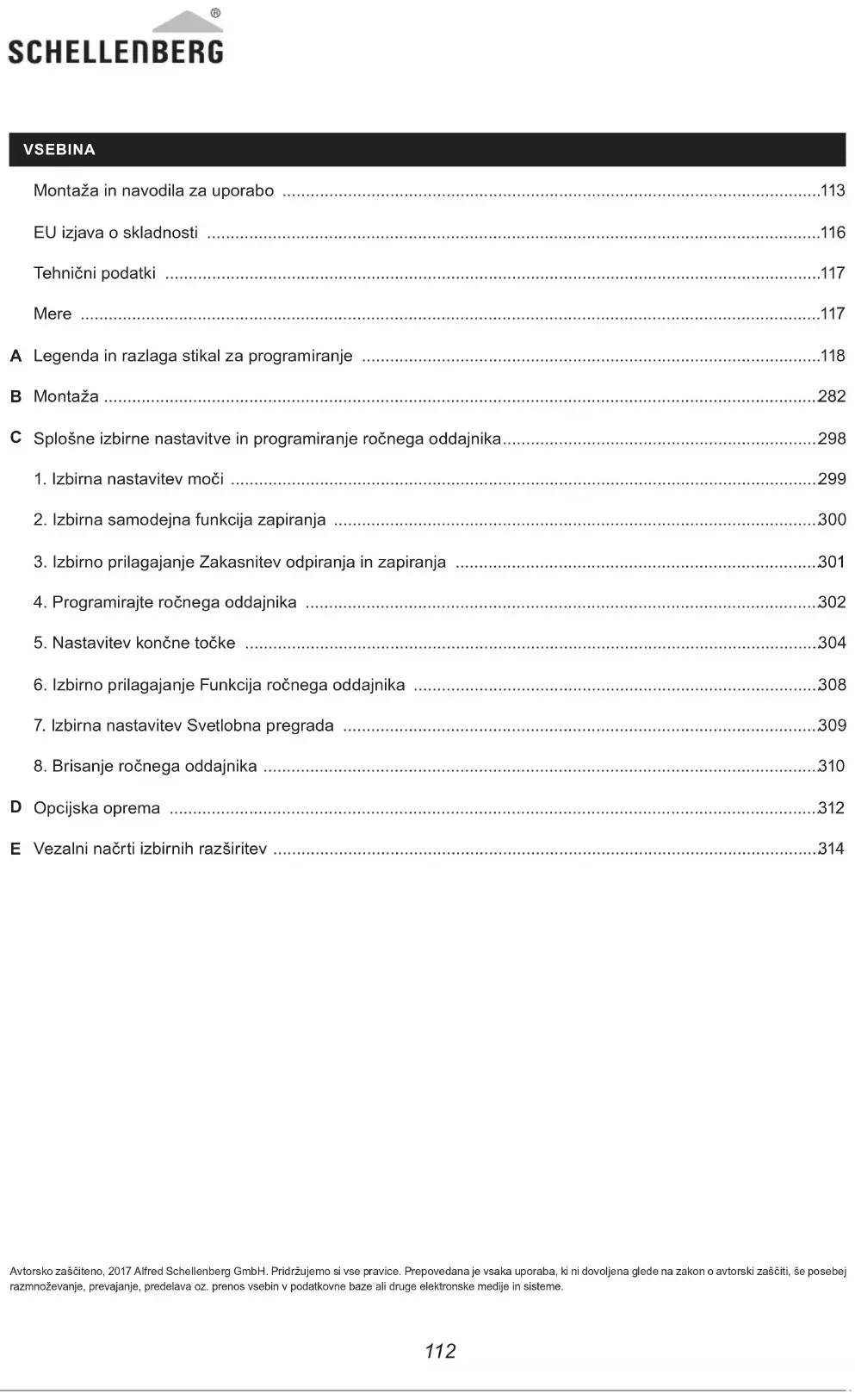Avtorsko zaščiteno, 2017 Alfred Schellenberg GmbH. Pridržujemo si vse pravice. Prepovedana je vsaka uporaba, ki ni dovoljena glede na zakon o avtorski zaščiti, še posebej razmnoževanje, prevajanje, predelava oz. prenos vsebin v podatkovne baze ali druge elektronske medije in sisteme.