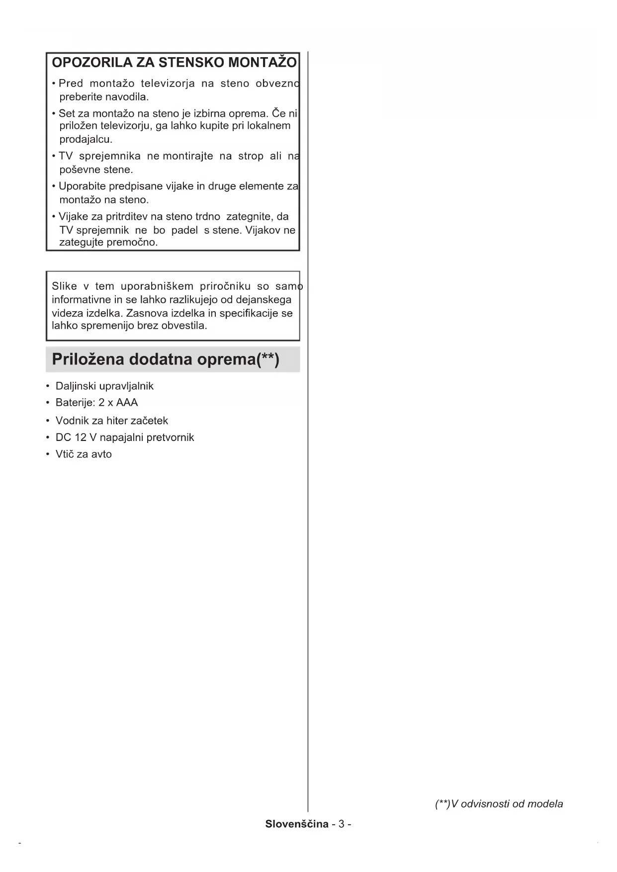 - Vijake za pritrditev na steno trdno zategnite, da TV sprejemnik ne bo padel s stene. Vijakov ne zategujte premočno. Slike v tem uporabniškem priročniku so samo informativne in se lahko razlikujejo od dejanskega videza izdelka. Zasnova izdelka in specikacije se lahko spremenijo brez obvestila. Priložena dodatna oprema(**)