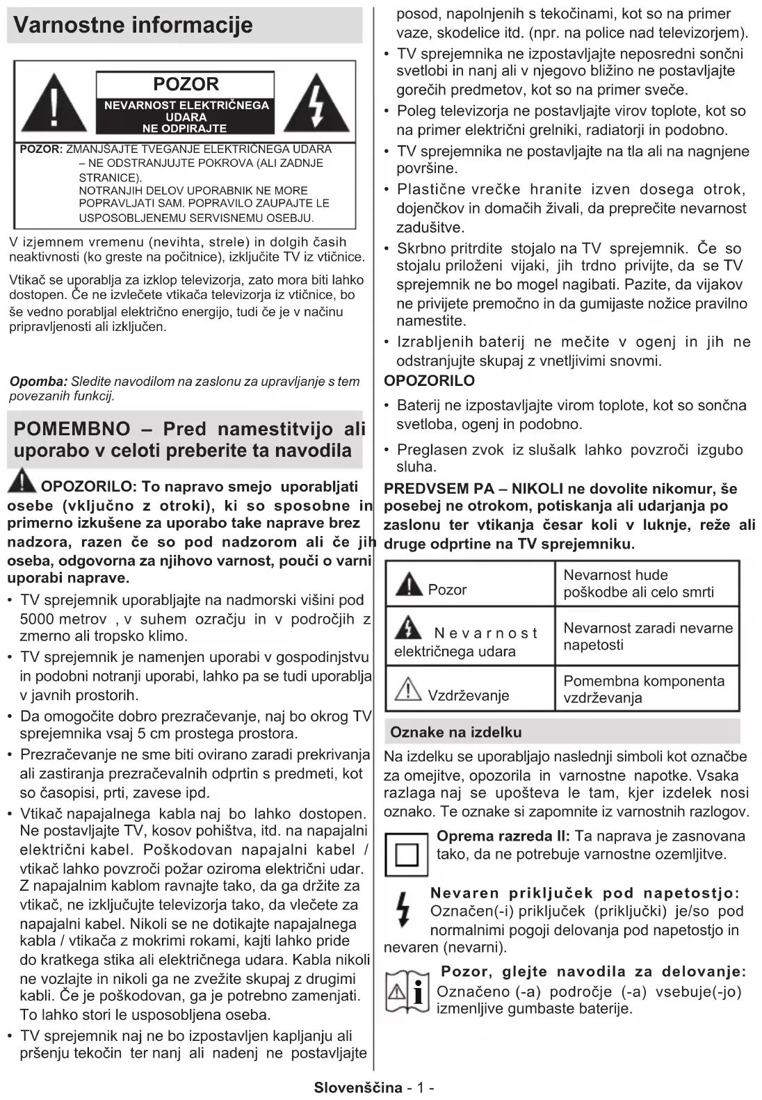 (**)Εξαρτάται από το μοντέλοSlovenščina - 1 - Varnostne informacije POZOR NEVARNOST ELEKTRIČNEGA UDARANE ODPIRAJTEPOZOR: Opomba: Sledite navodilom na zaslonu za upravljanje s tem povezanih funkcij. POMEMBNO – Pred namestitvijo ali uporabo v celoti preberite ta navodila OPOZORILO: To napravo smejo uporabljati osebe (vključno z otroki), ki so sposobne in primerno izkušene za uporabo take naprave brez nadzora, razen če so pod nadzorom ali če jih oseba, odgovorna za njihovo varnost, pouči o varni uporabi naprave.