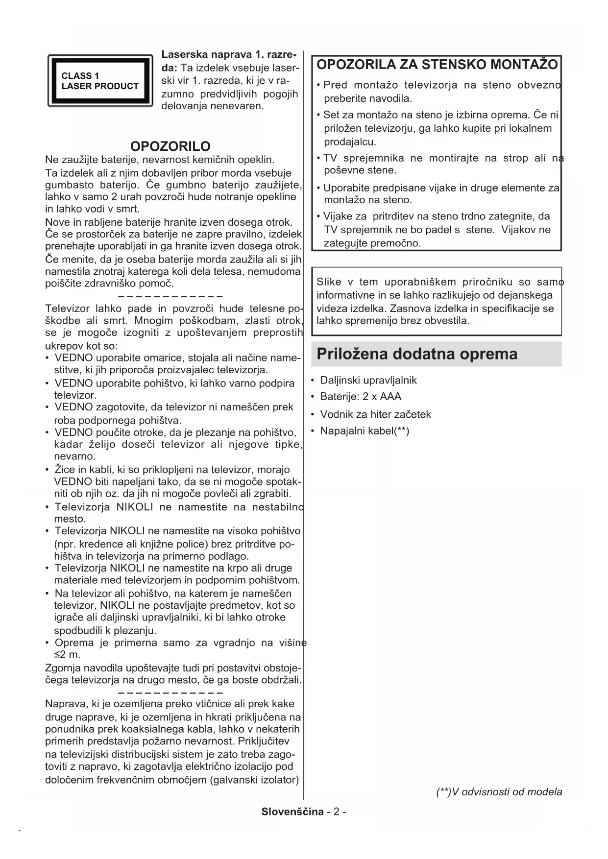 (**)Εξαρτάται από το μοντέλοSlovenščina - 1 - Varnostne informacije POZOR NEVARNOST ELEKTRIČNEGA UDARANE ODPIRAJTEPOZOR: Opomba: Sledite navodilom na zaslonu za upravljanje s tem povezanih funkcij. POMEMBNO – Pred namestitvijo ali uporabo v celoti preberite ta navodila OPOZORILO: To napravo smejo uporabljati osebe (vključno z otroki), ki so sposobne in primerno izkušene za uporabo take naprave brez nadzora, razen če so pod nadzorom ali če jih oseba, odgovorna za njihovo varnost, pouči o varni uporabi naprave.