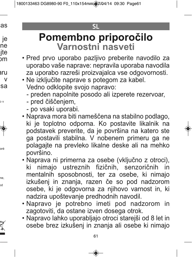1800133463 DG8980-90 F0_110x154mm 17/04/14 09:30 Page62 ustreznih fizičnih, senzoričnih in mentalnih sposobnosti, če so usposobljeni in vodeni pri uporabi naprave in če se zavedajo nevarnosti. Otroci se ne smejo igrati z napravo. Otroci ne smejo čistiti in vzdrževati naprave razen če so starejši od 8 let in pod nadzorom. Hranite napravo in njene priključke izven dosega otrok, ki so mlajših od 8 let.