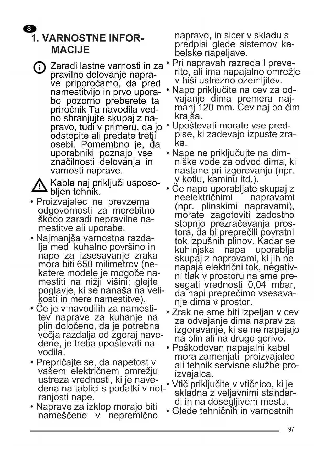 - Če napo uporabljate skupaj z neelektričnimi napravami (npr. plinskimi napravami), morate zagotoviti zadostno stopnjo prezračevanja pros- tora, da bi preprečili povratni tok izpušnih plinov. Kadar se kuhinjska napa uporablja skupaj z napravami, ki jih ne napaja električni tok, negativ- ni tlak v prostoru na sme pre- segati vrednosti 0,04 mbar, da napi preprečimo vsesava- nje dima v prostor.