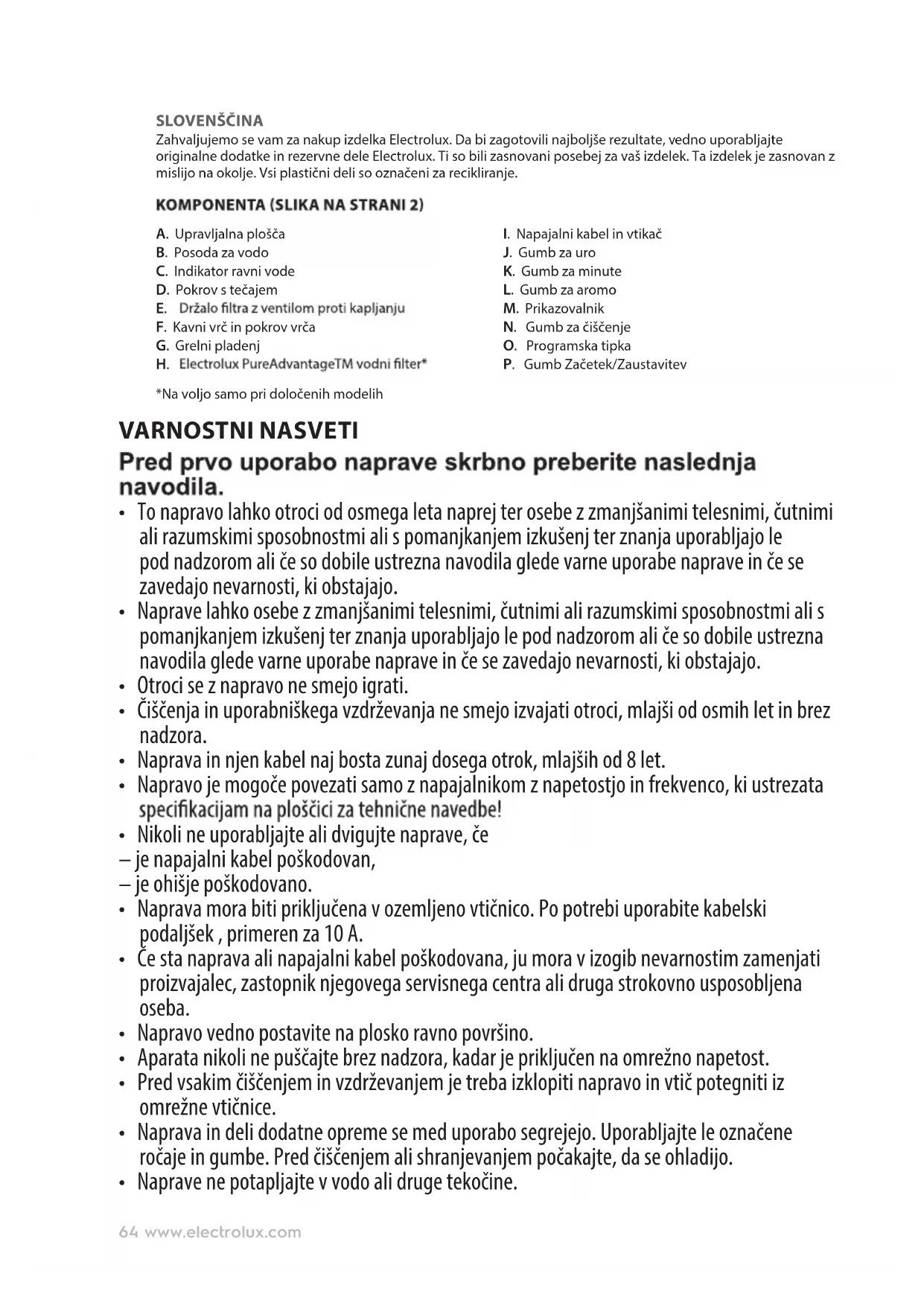 8 Izbirnik arome omogoča podaljšanje časa kuhanja in izločanja arome za pripravo močnejše kave za manjše število skodelic (običajno manj kot 6). 65www.electrolux.com