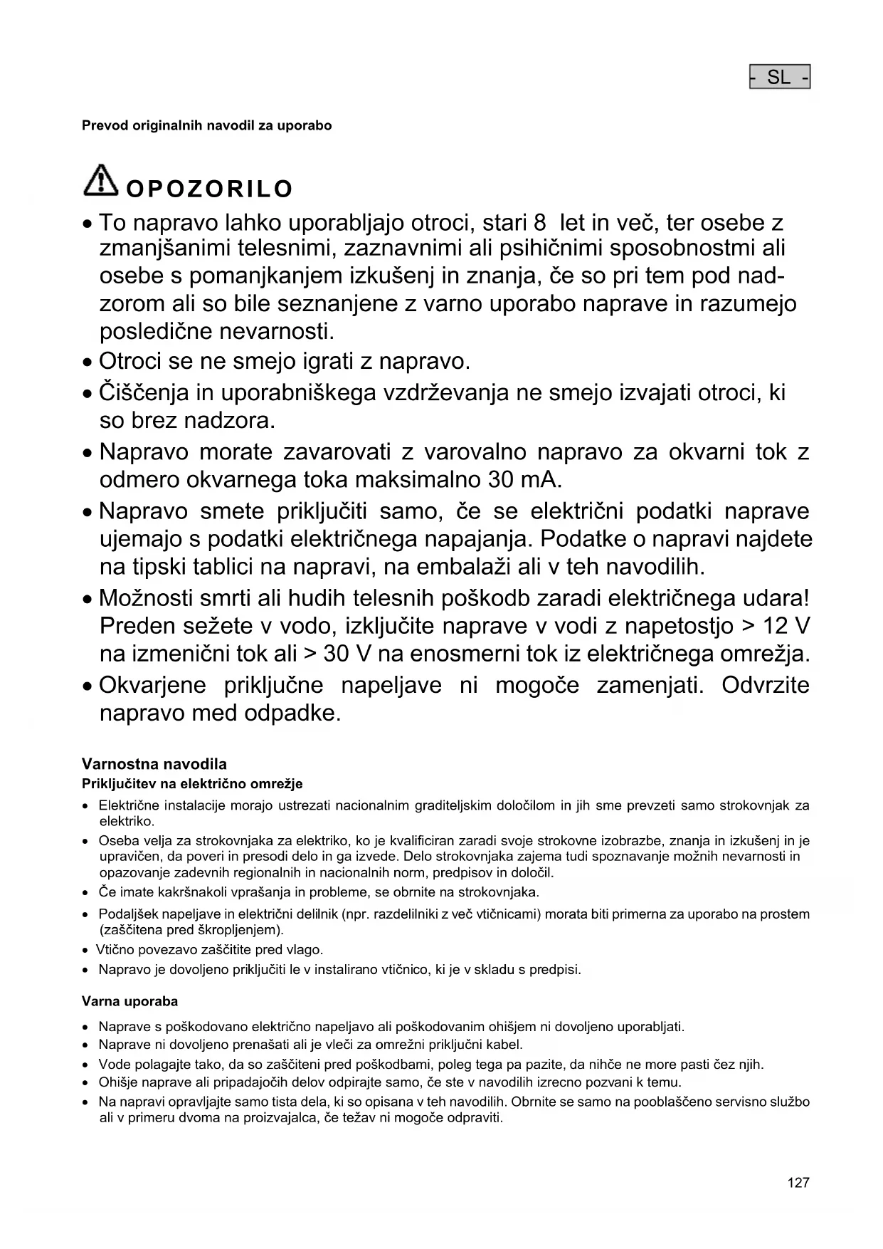 - Preden sežete v vodo, odklopite iz omrežne napetosti vse v vodi nahajajoče se naprave.